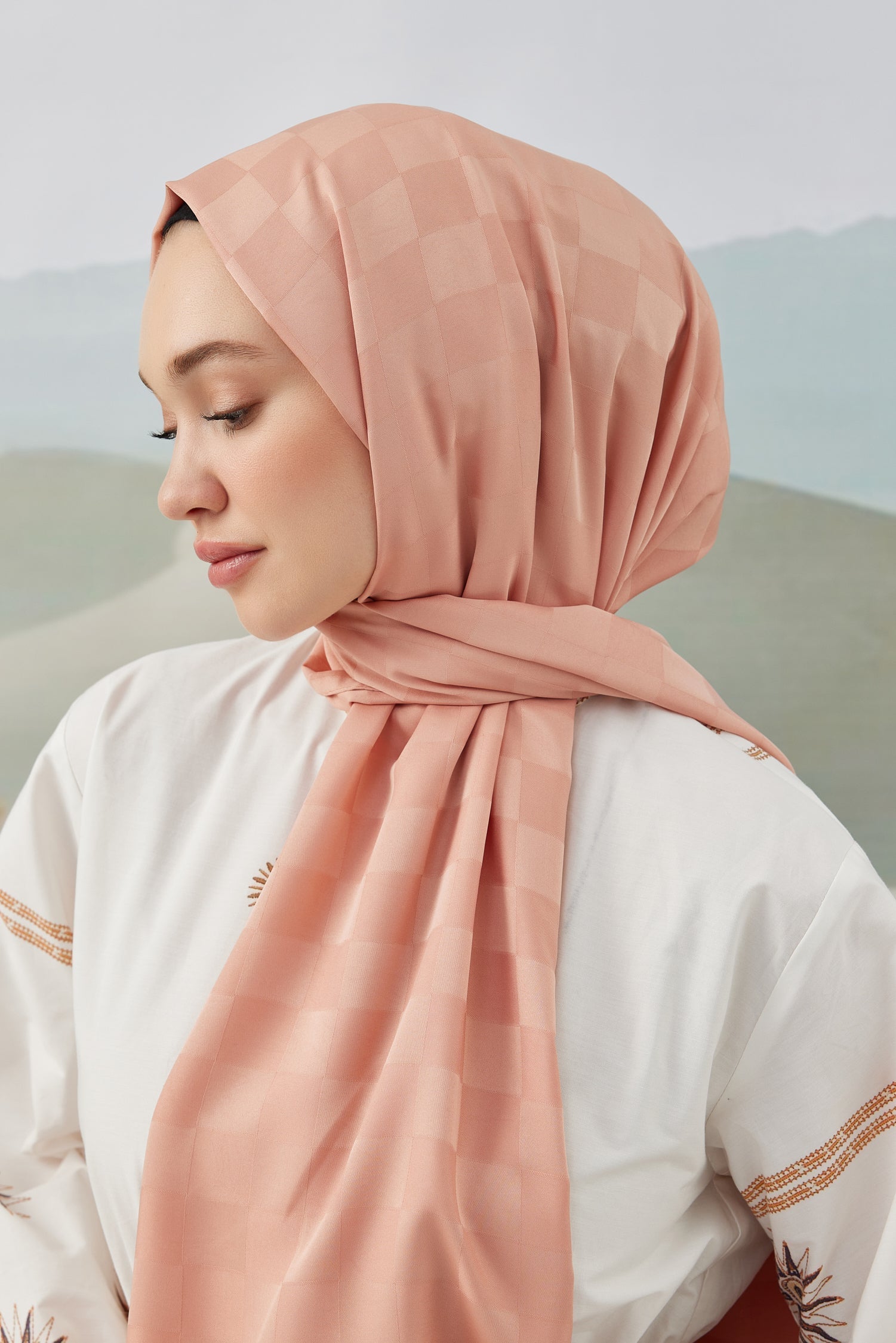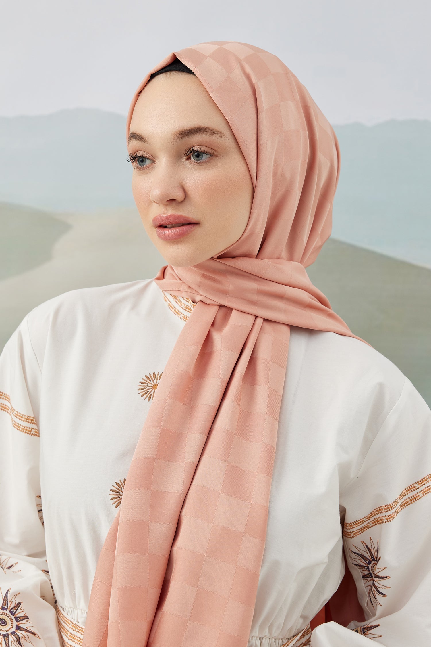 Dama Desen İpeksi Jakar Şal Yavruağzı Dama Desen İpek...