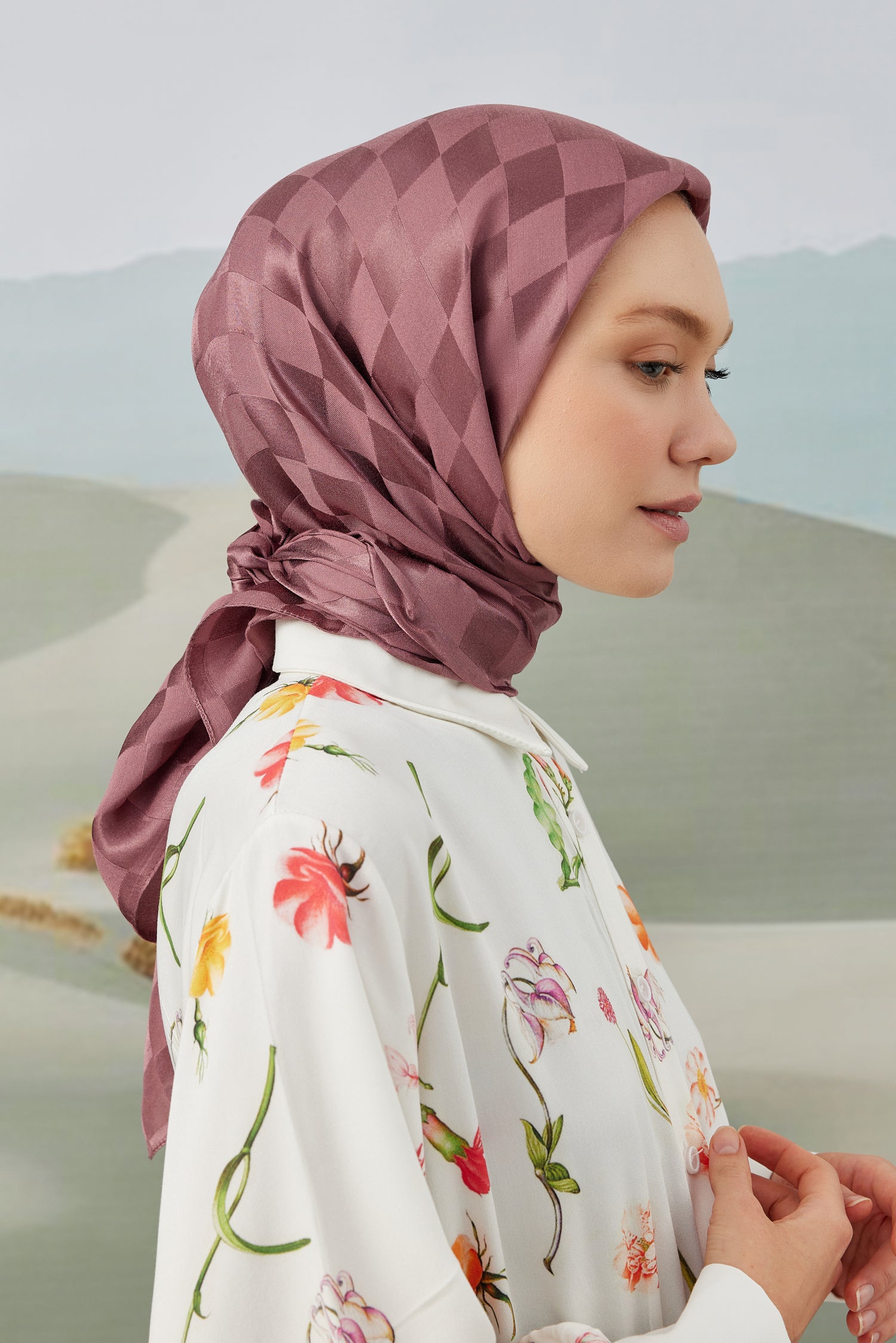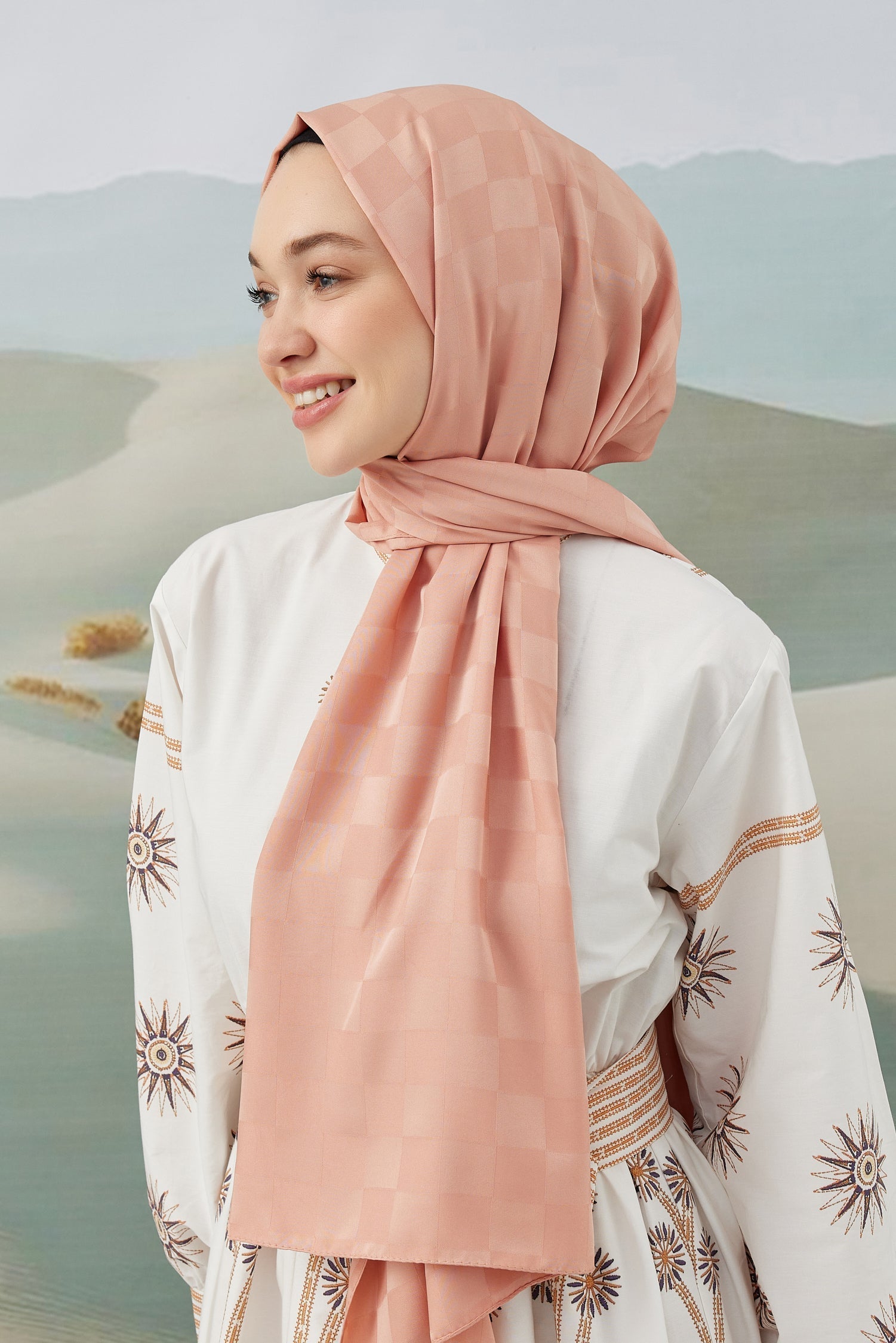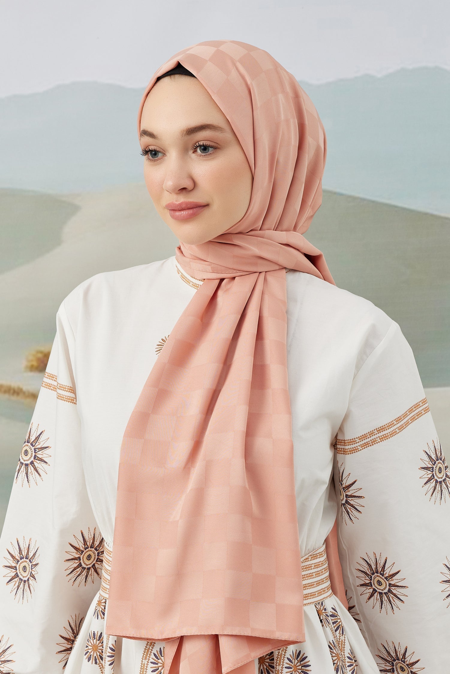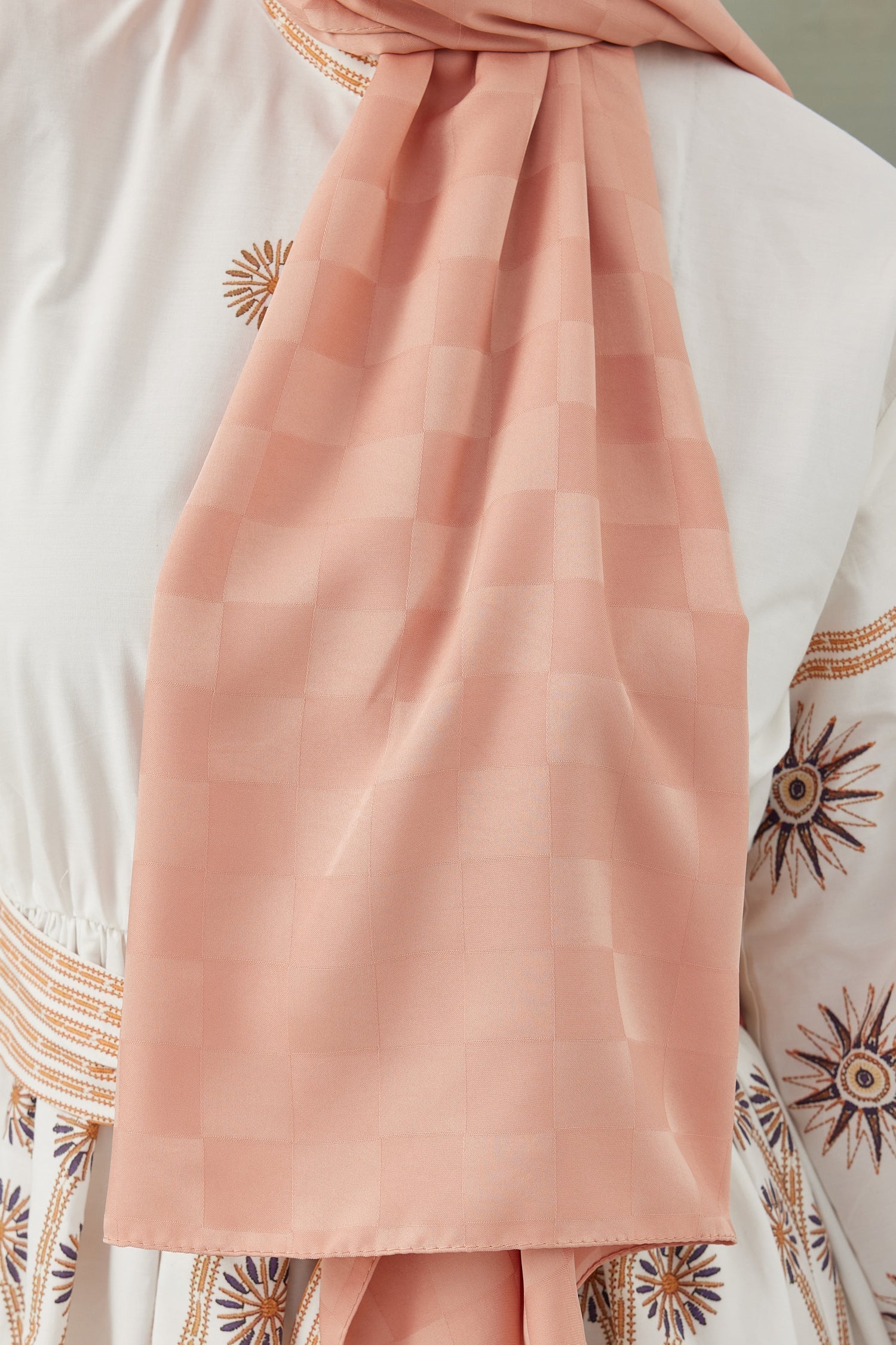 Dama Desen İpeksi Parlak Jakar Eşarp Gülkurusu Dama Desen İpek...