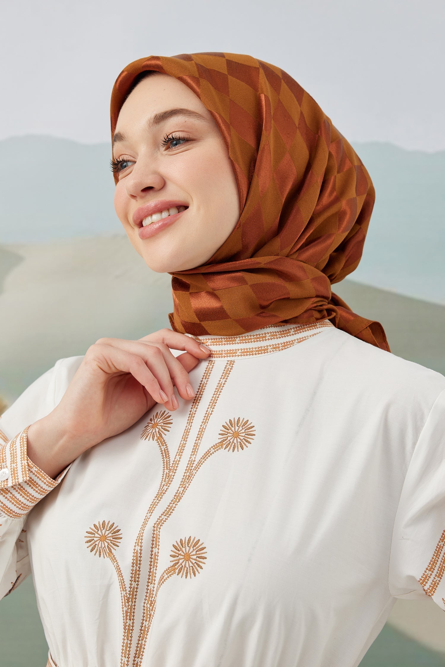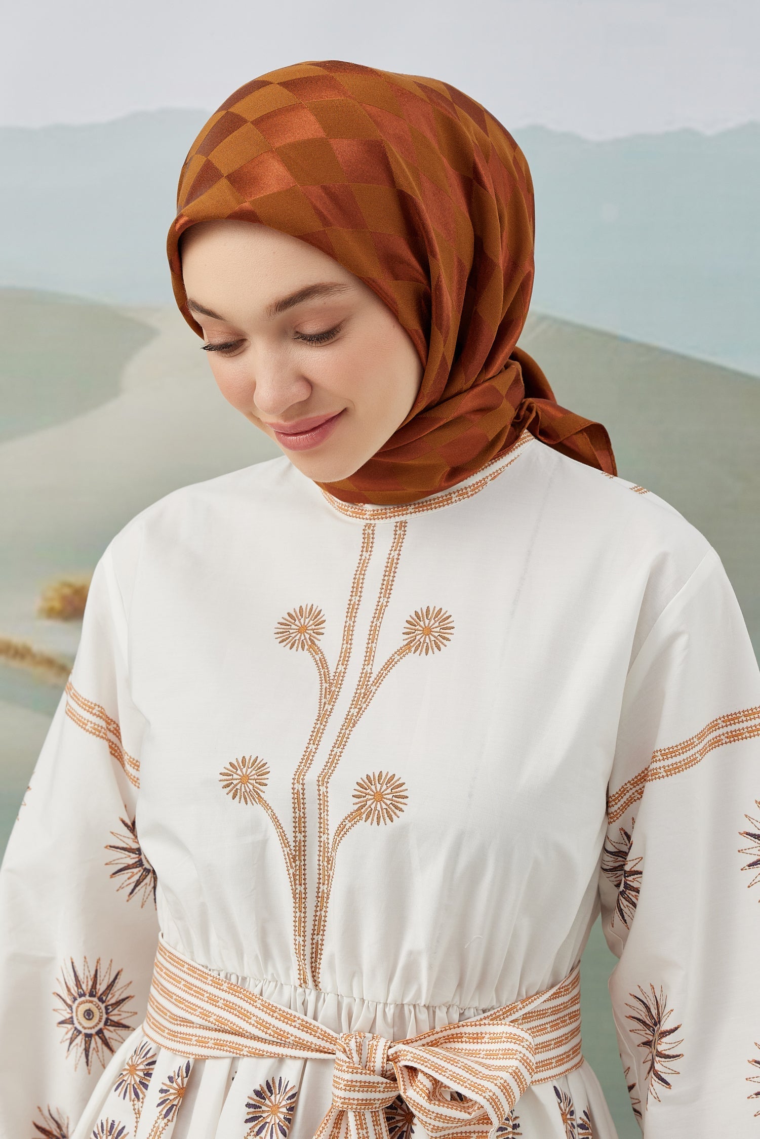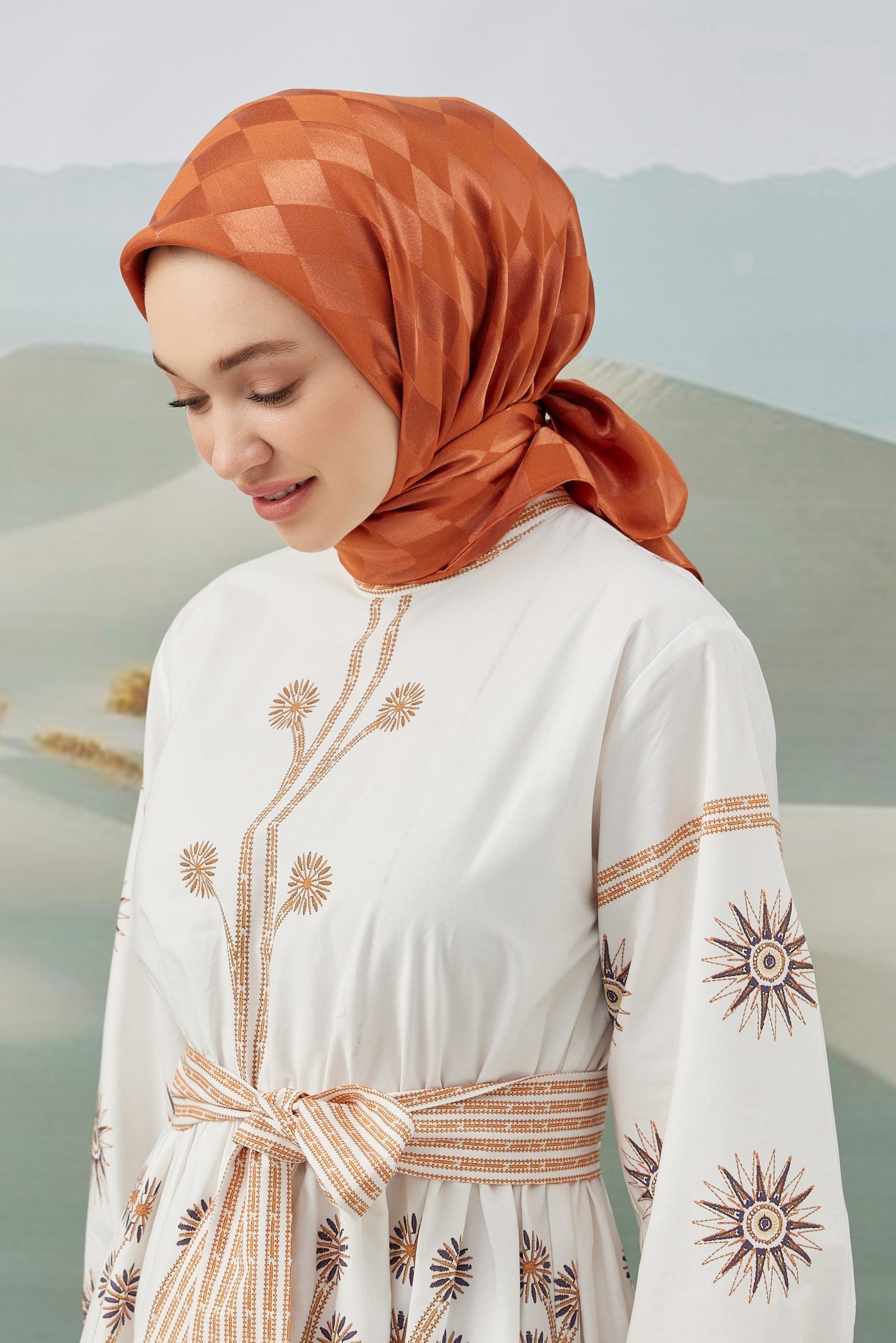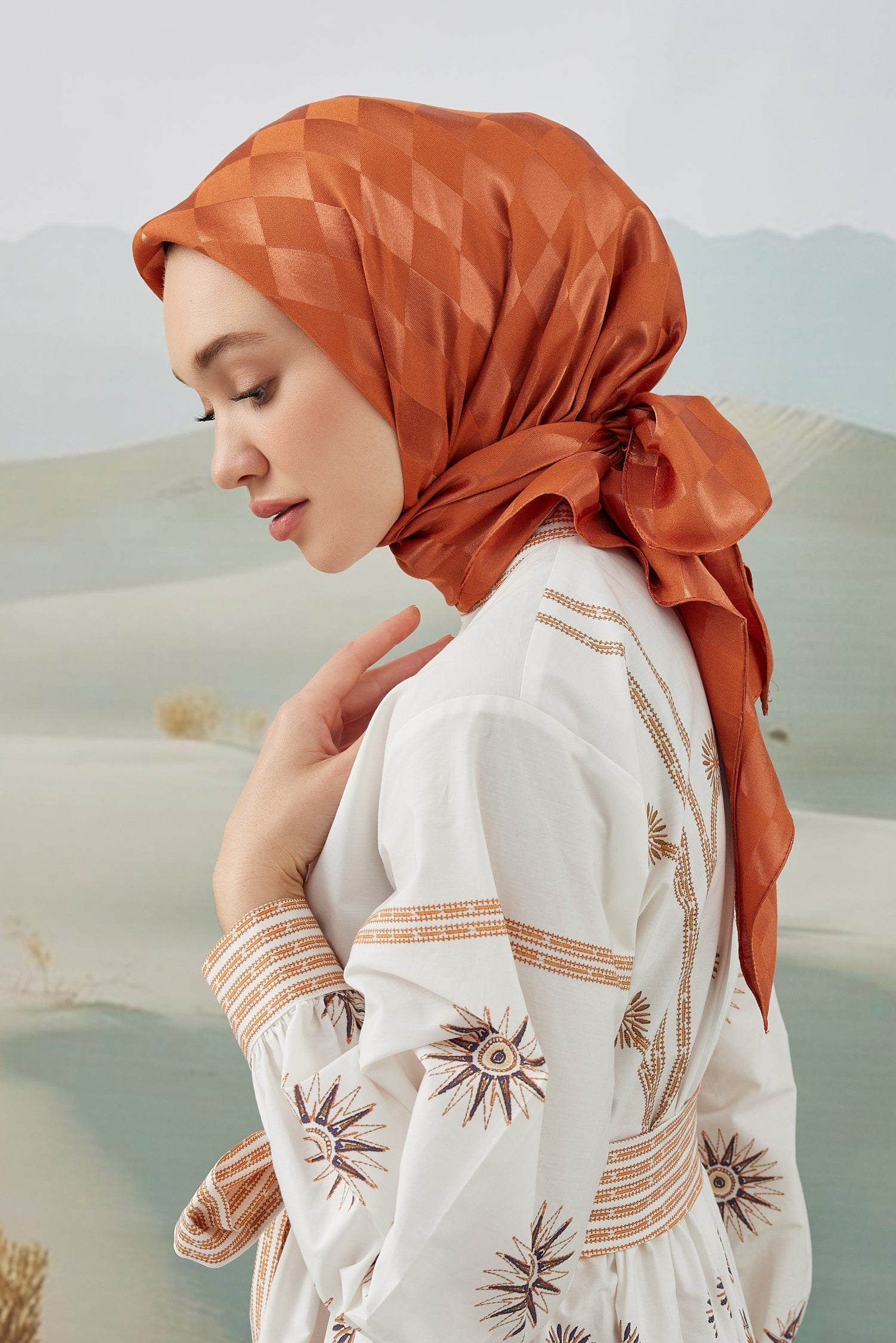 Dama Desen İpeksi Parlak Jakar Eşarp Kiremit Dama Desen İpek...