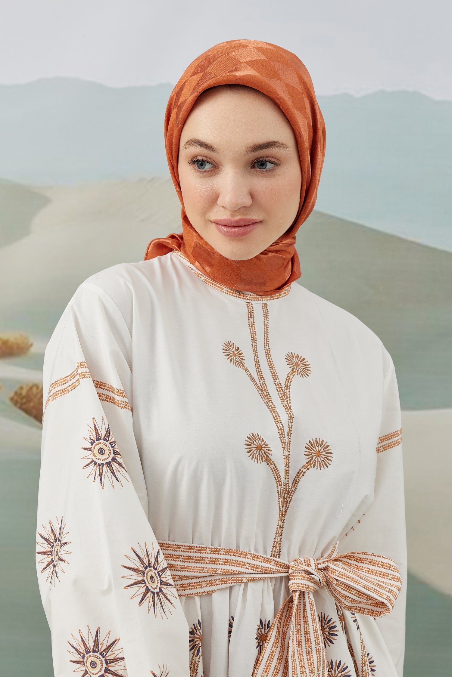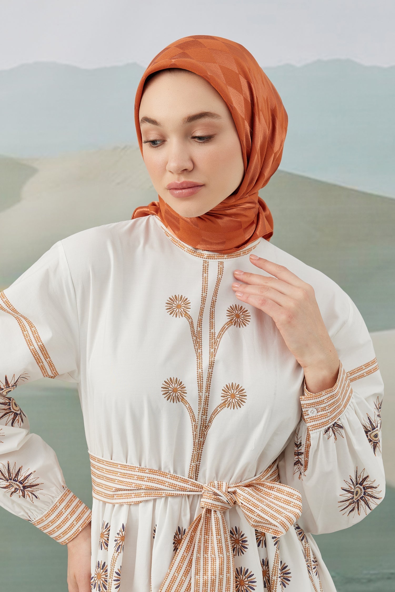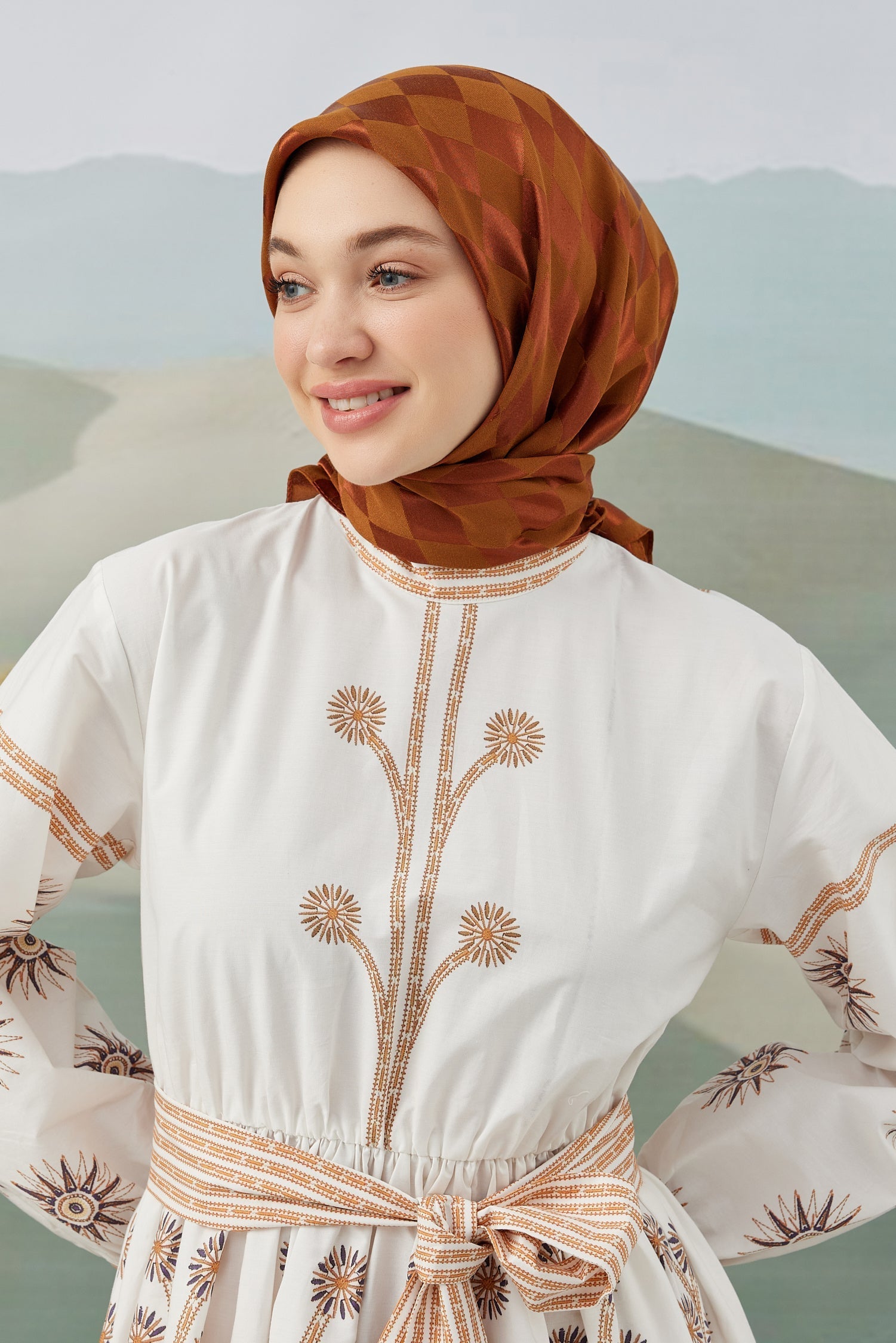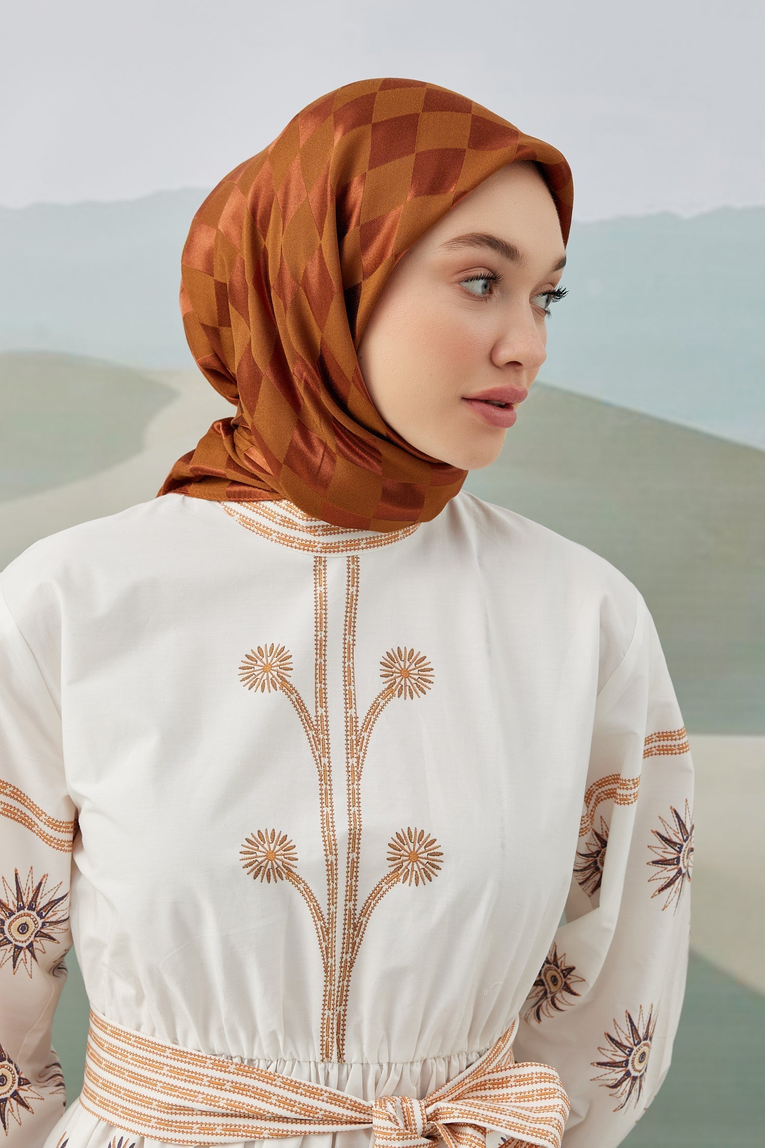 Dama Desen İpeksi Parlak Jakar Eşarp Kiremit Dama Desen İpek...