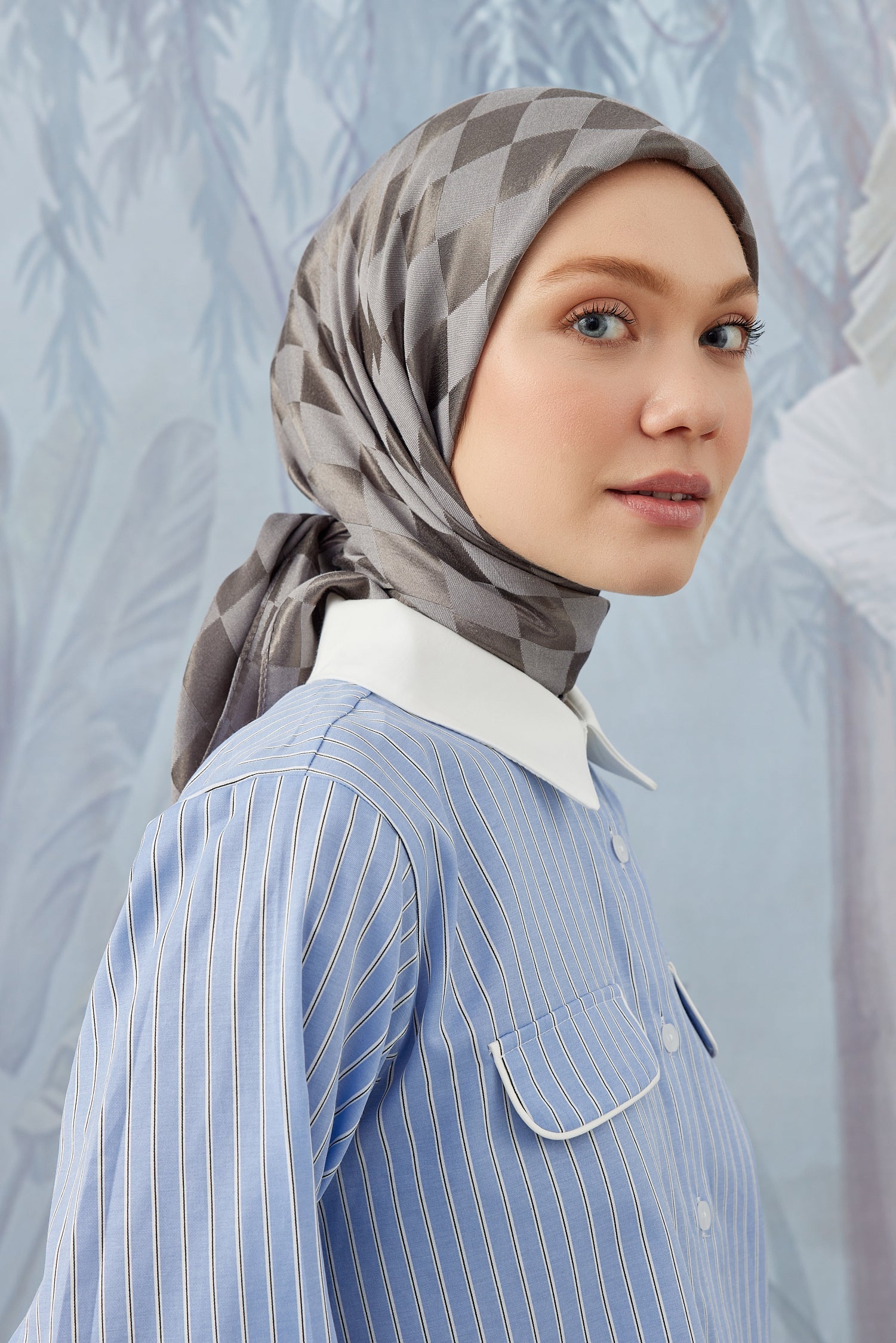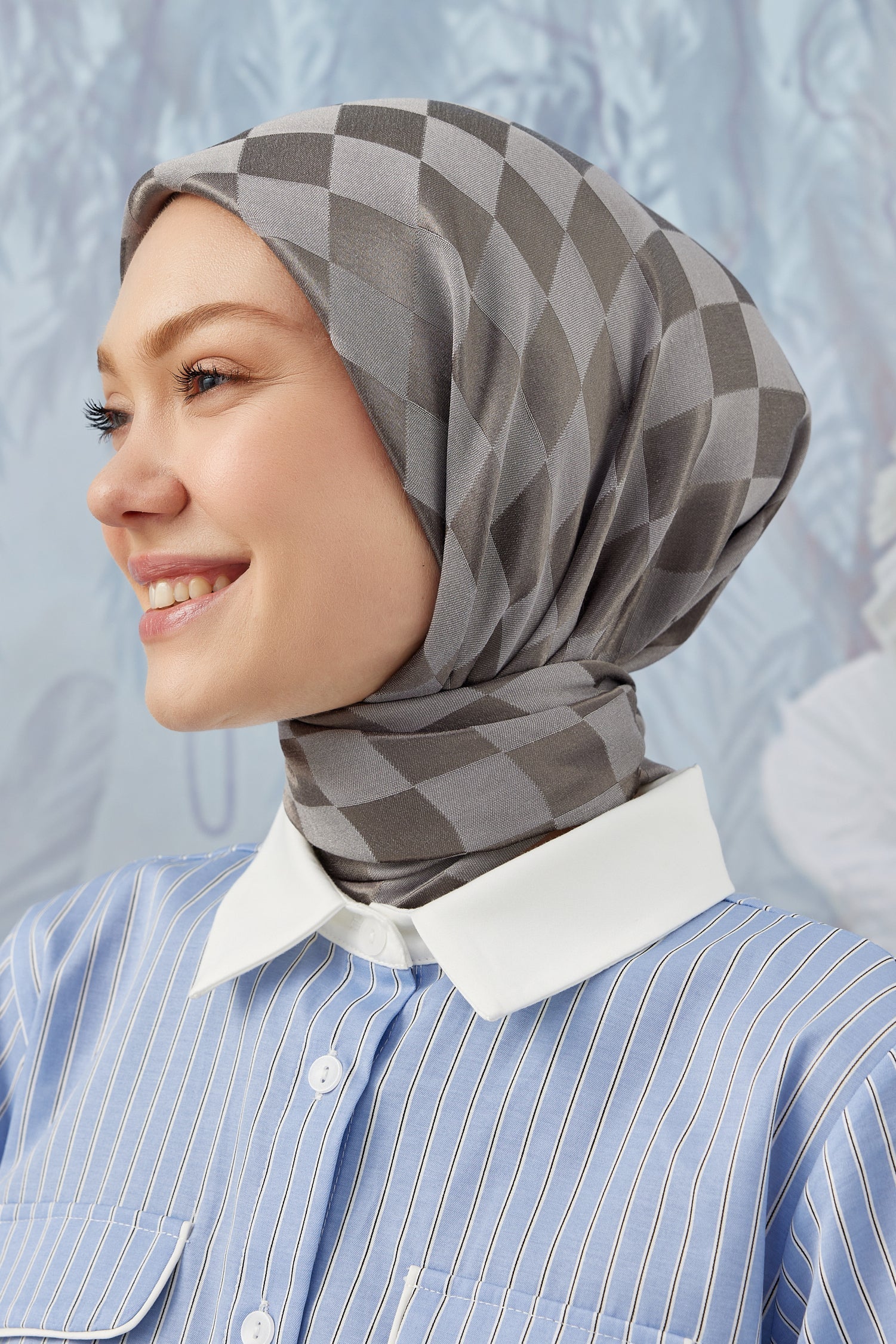 Dama Desen İpeksi Parlak Jakar Eşarp Gümüş Gri Dama Desen İpek...