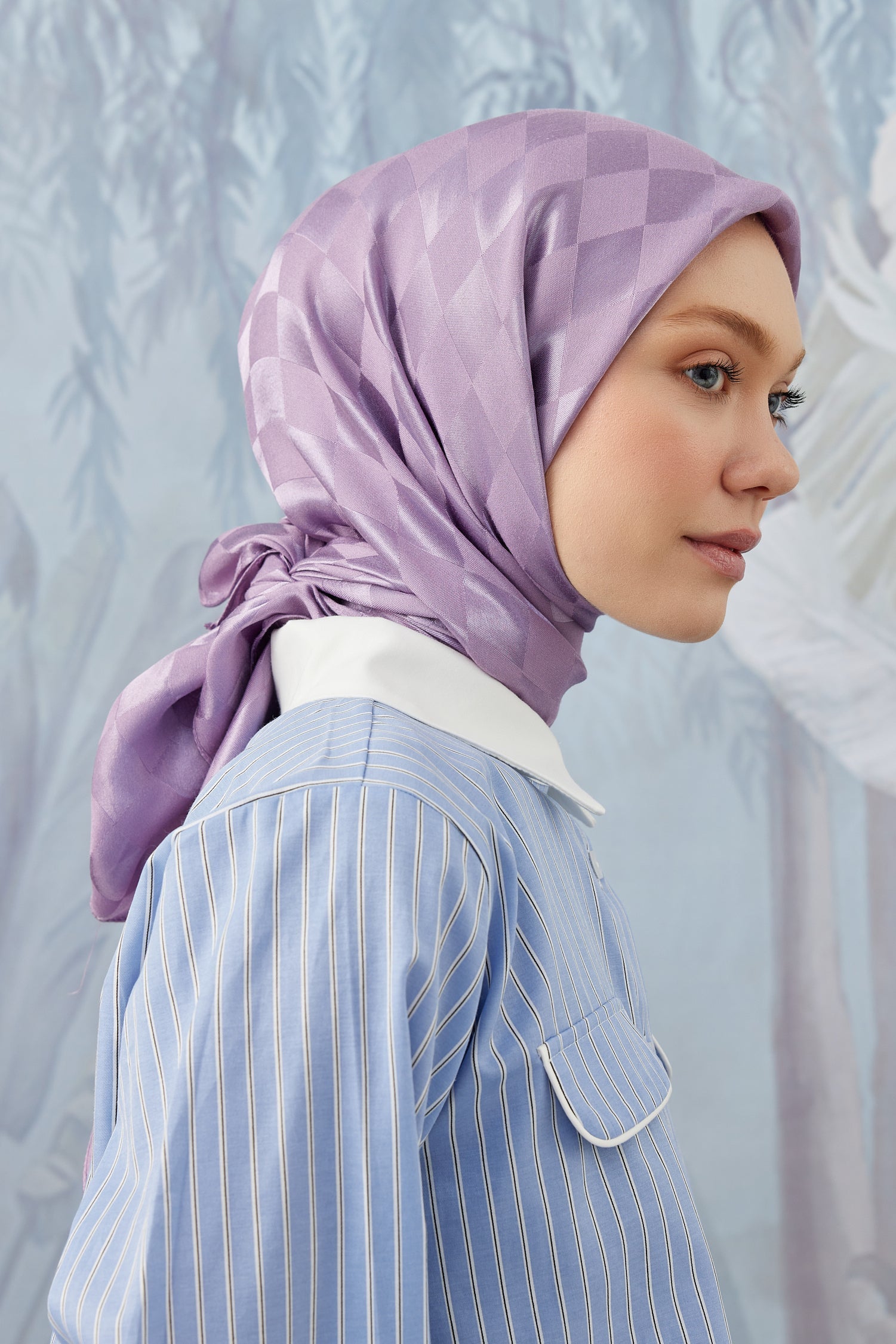 Dama Desen İpeksi Parlak Jakar Eşarp Lavanta Dama Desen İpek...