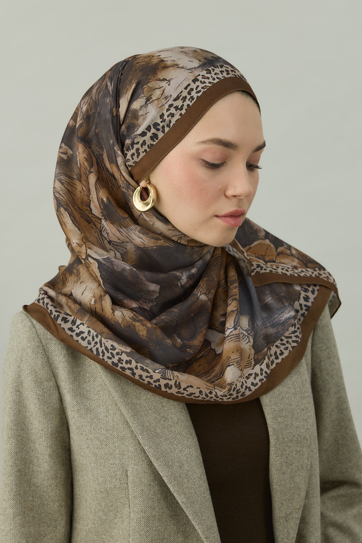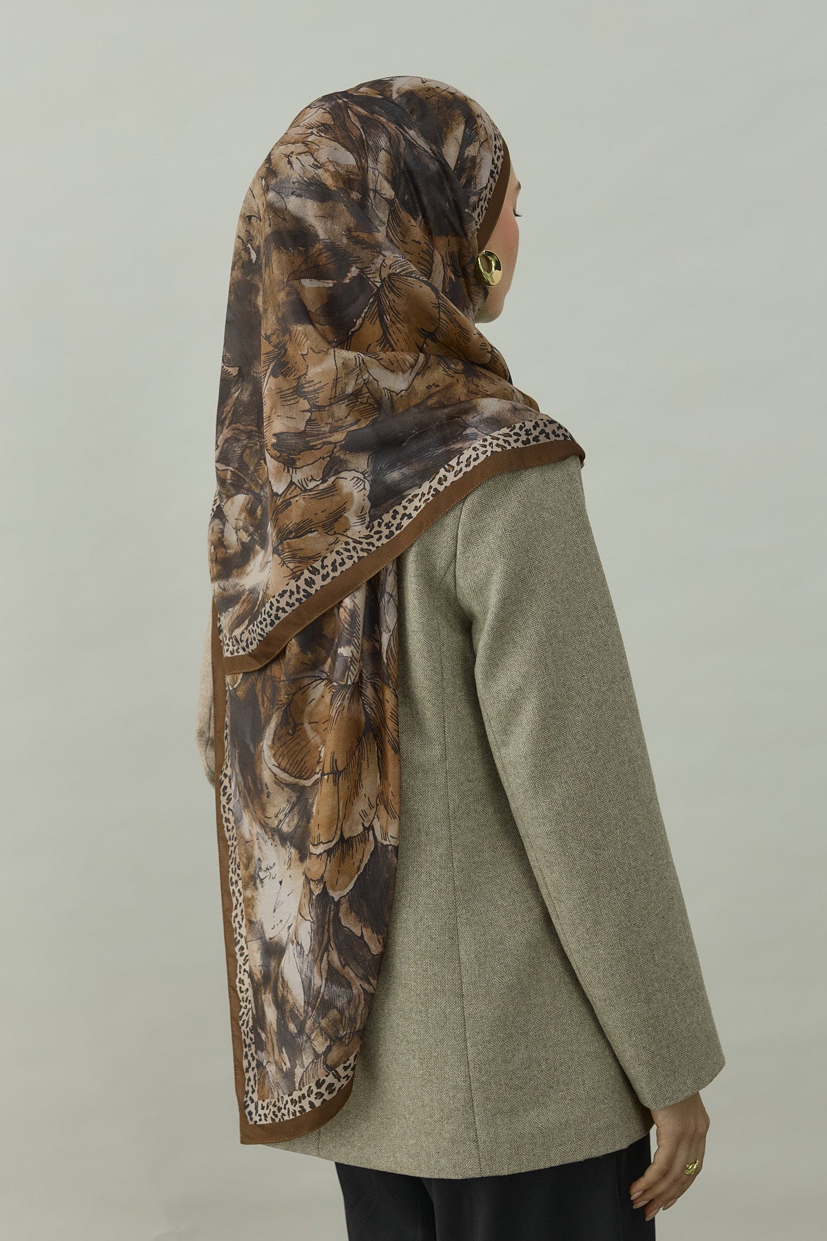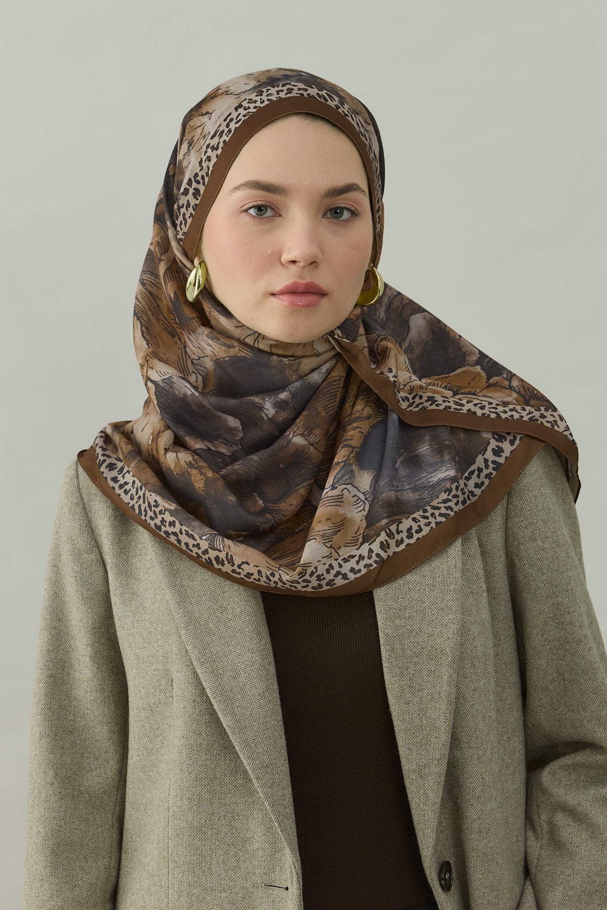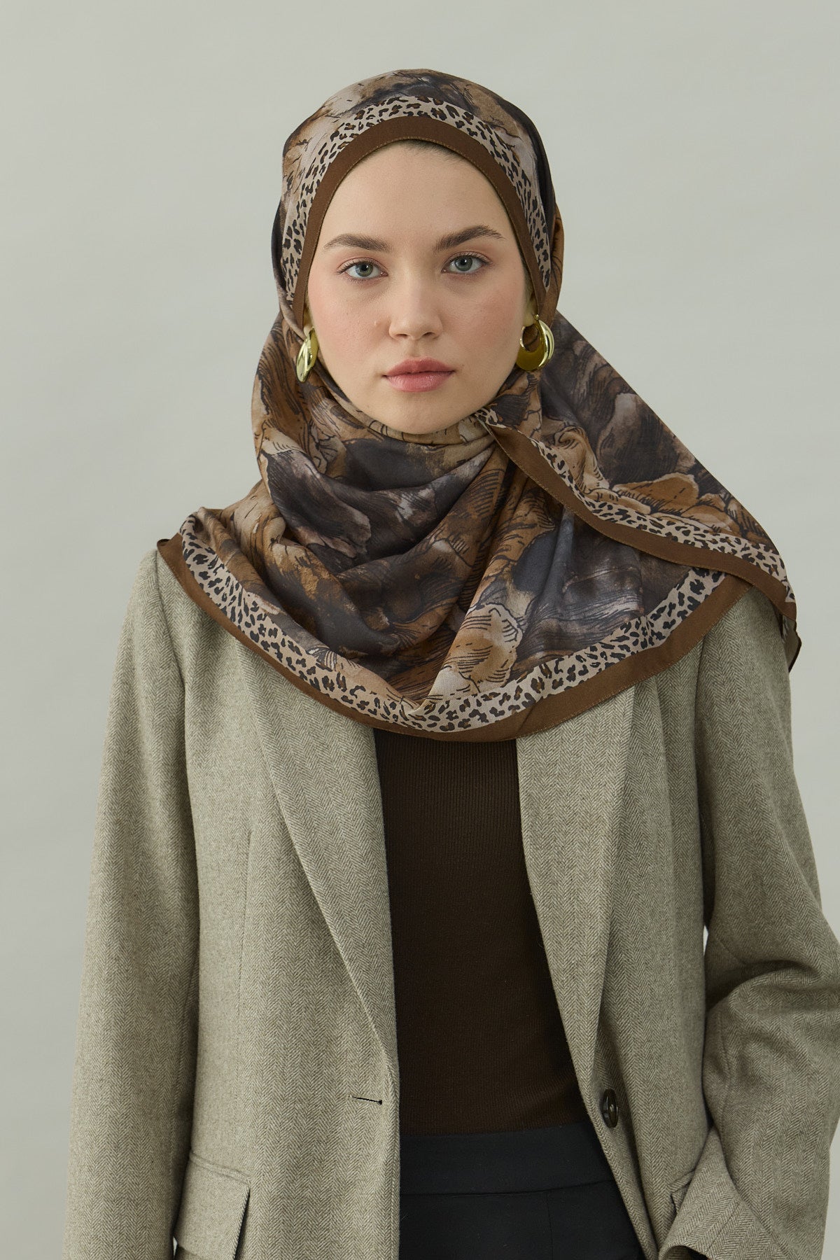 Hafif ve dökümlü yapısı başta kayma yapmadan rahat bir kullanım sunarken, boyunda hacimli ve zarif bir duruşla kombini tamamlar. Mevsim geçişlerinde, günlük şehir stilinde, ofiste ve hafta sonu buluşmalarında rahatlıkla tercih edebileceğiniz, zamansız ve feminen bir kahverengi çiçek desenli şal alternatifi sunar.