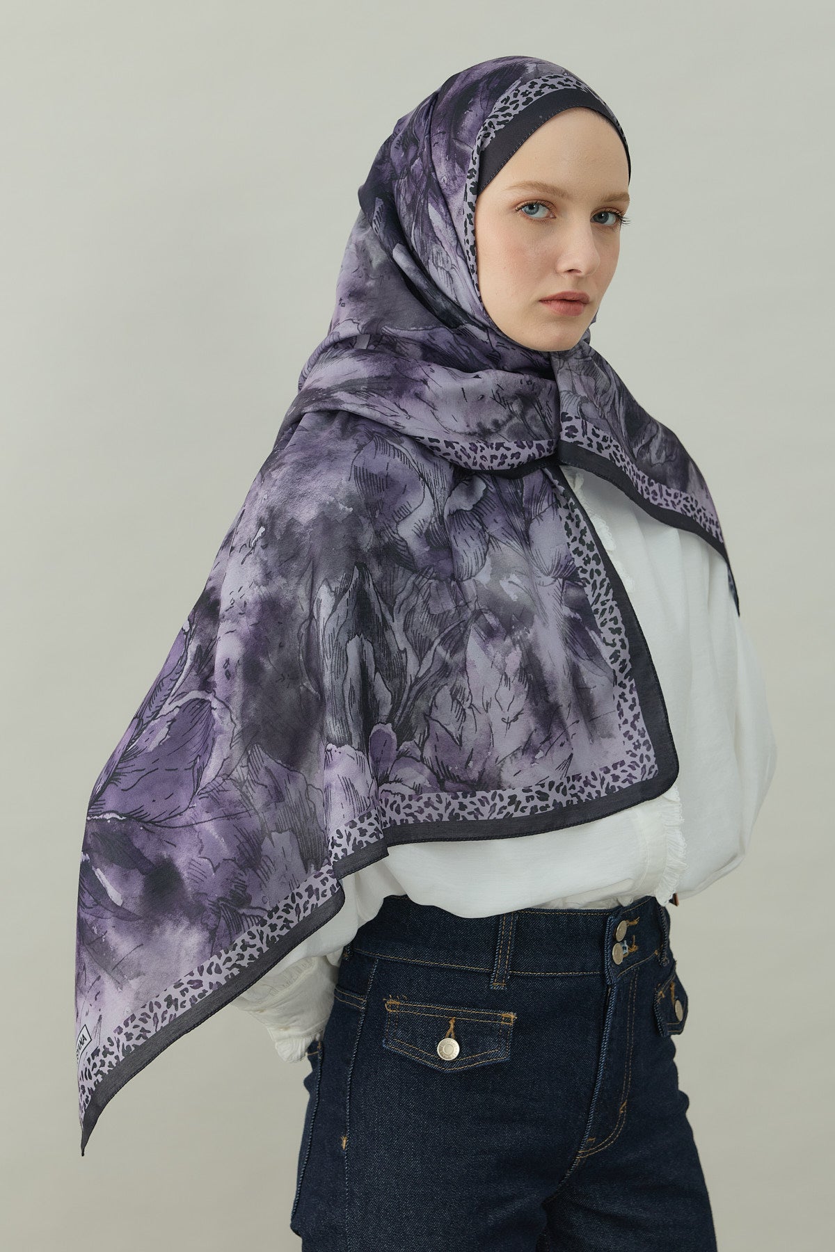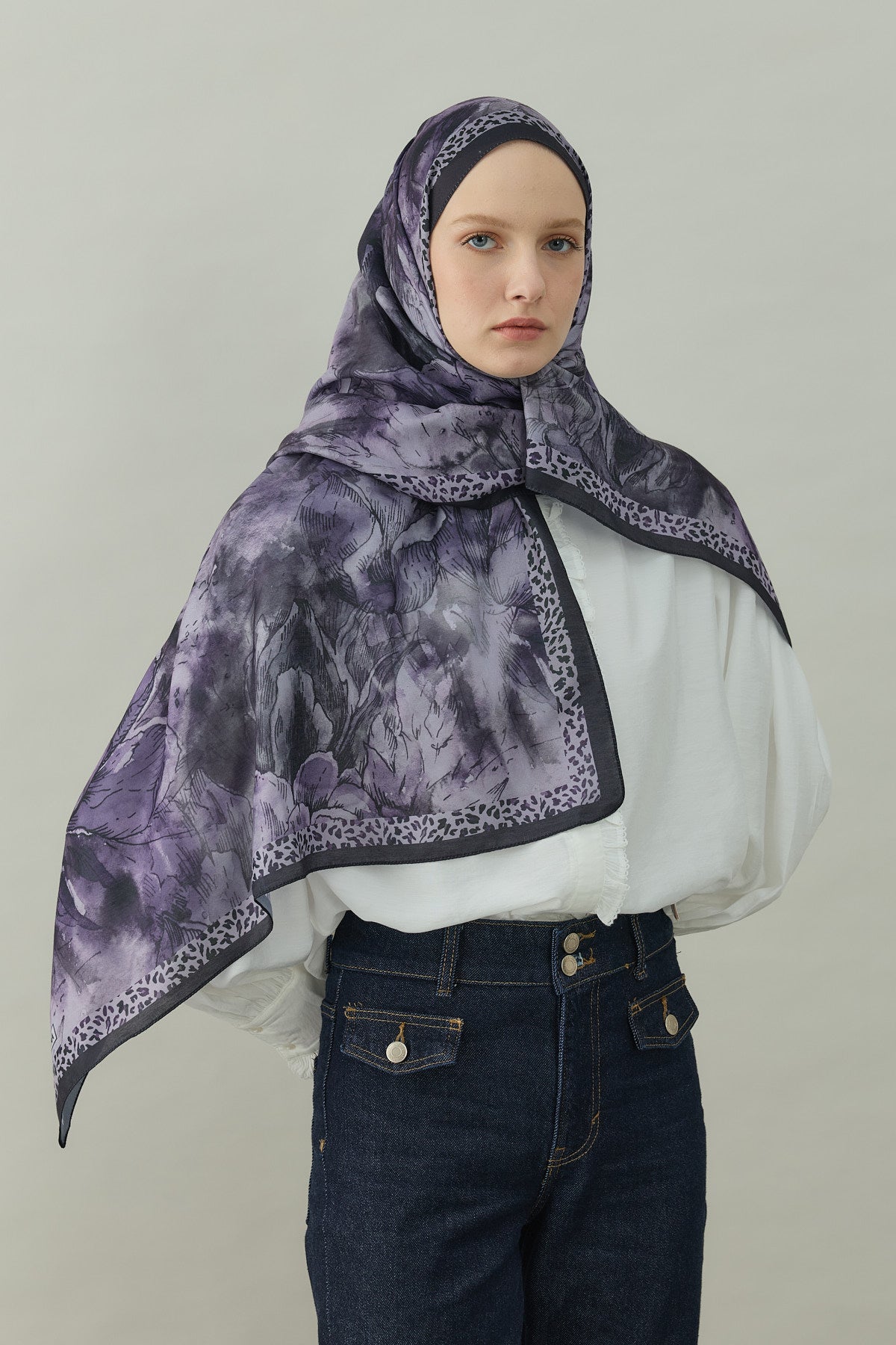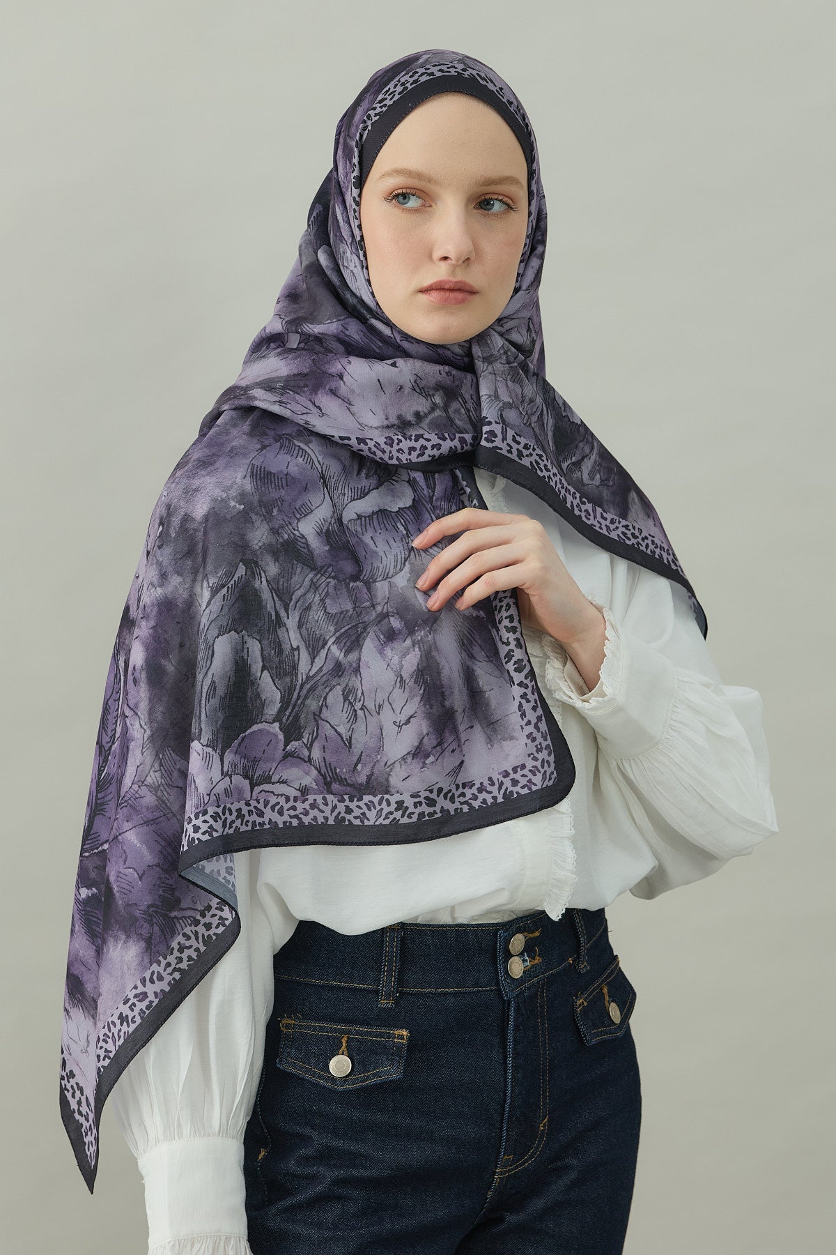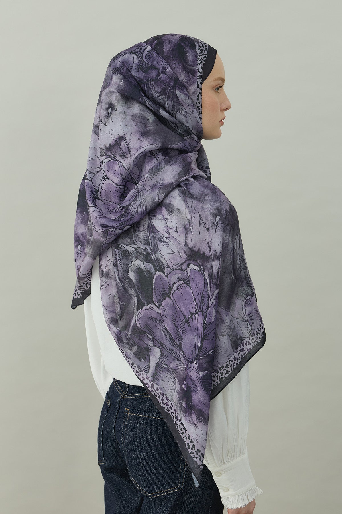 Bu kombinle mor çiçek desenli şal, nötr tonlarla buluşarak modern, güçlü ve zarif bir günlük tesettür kombini ortaya çıkarır.