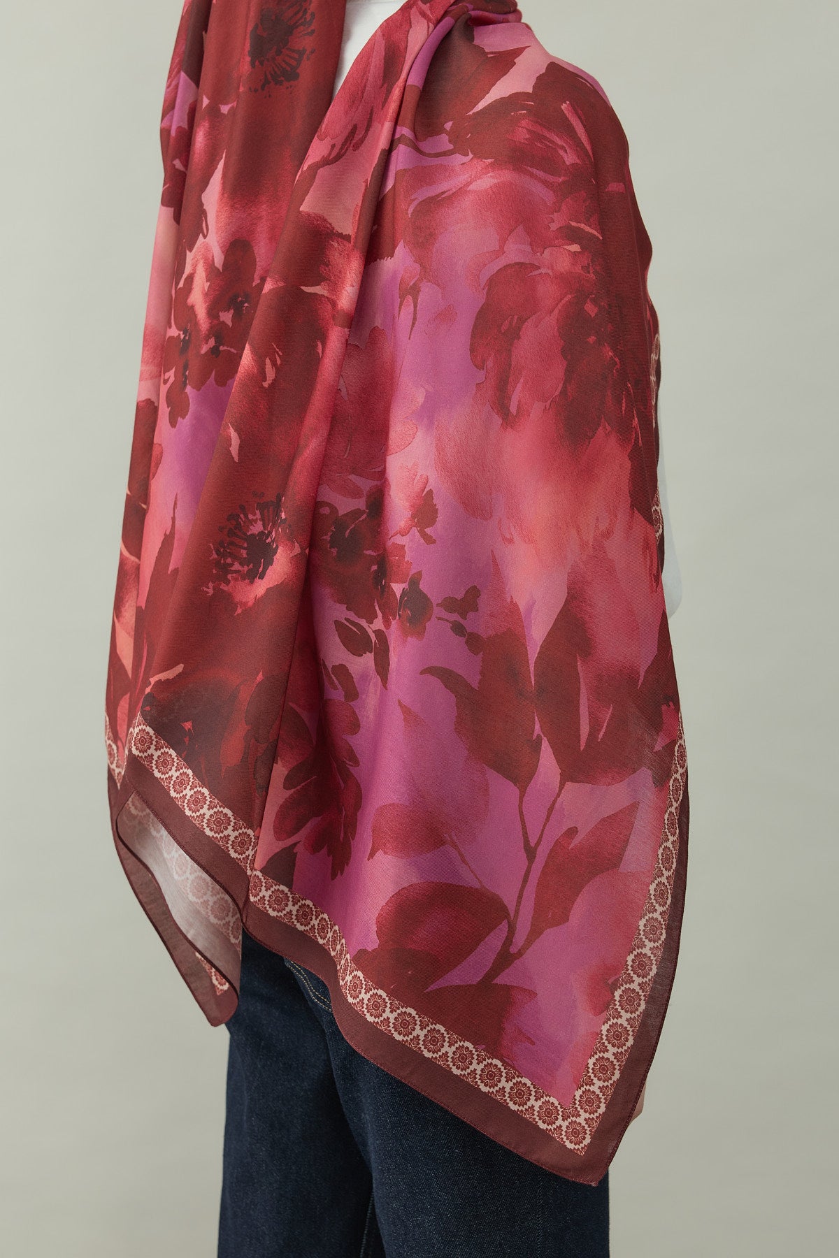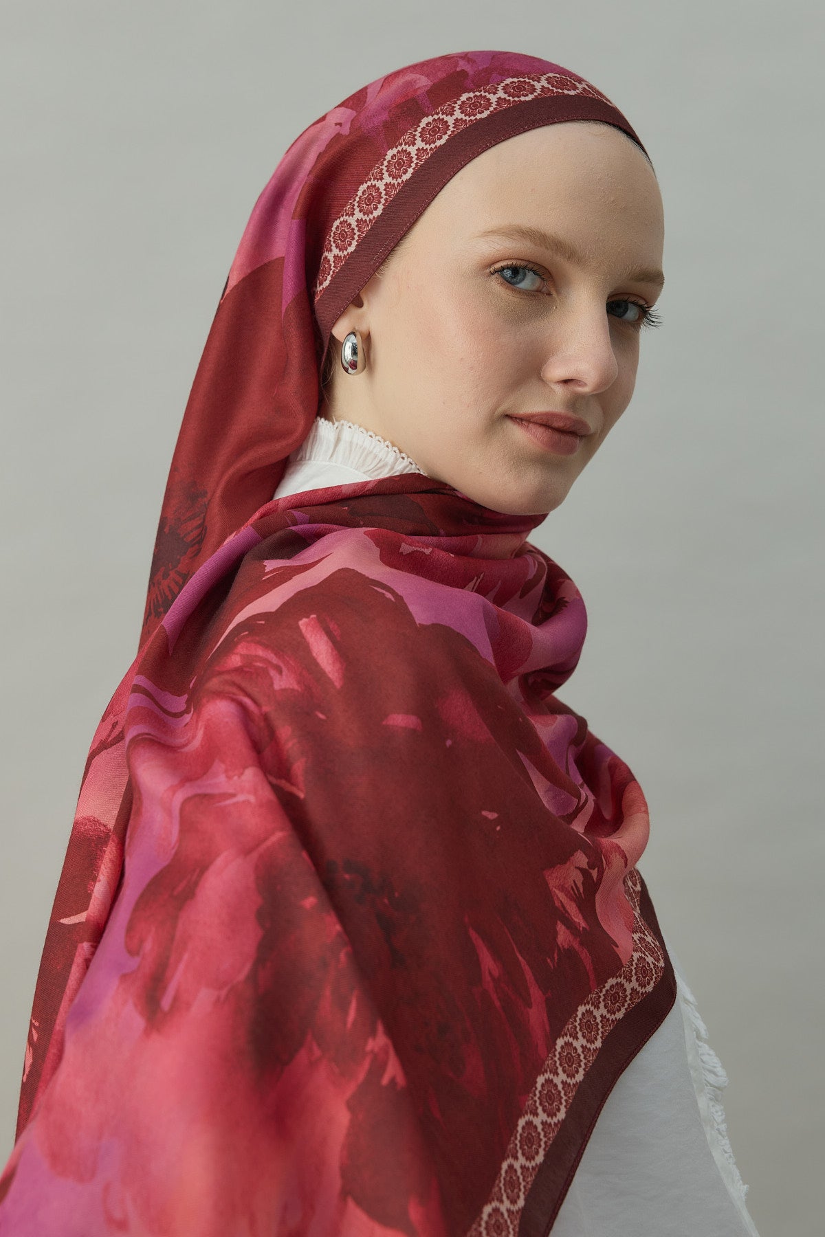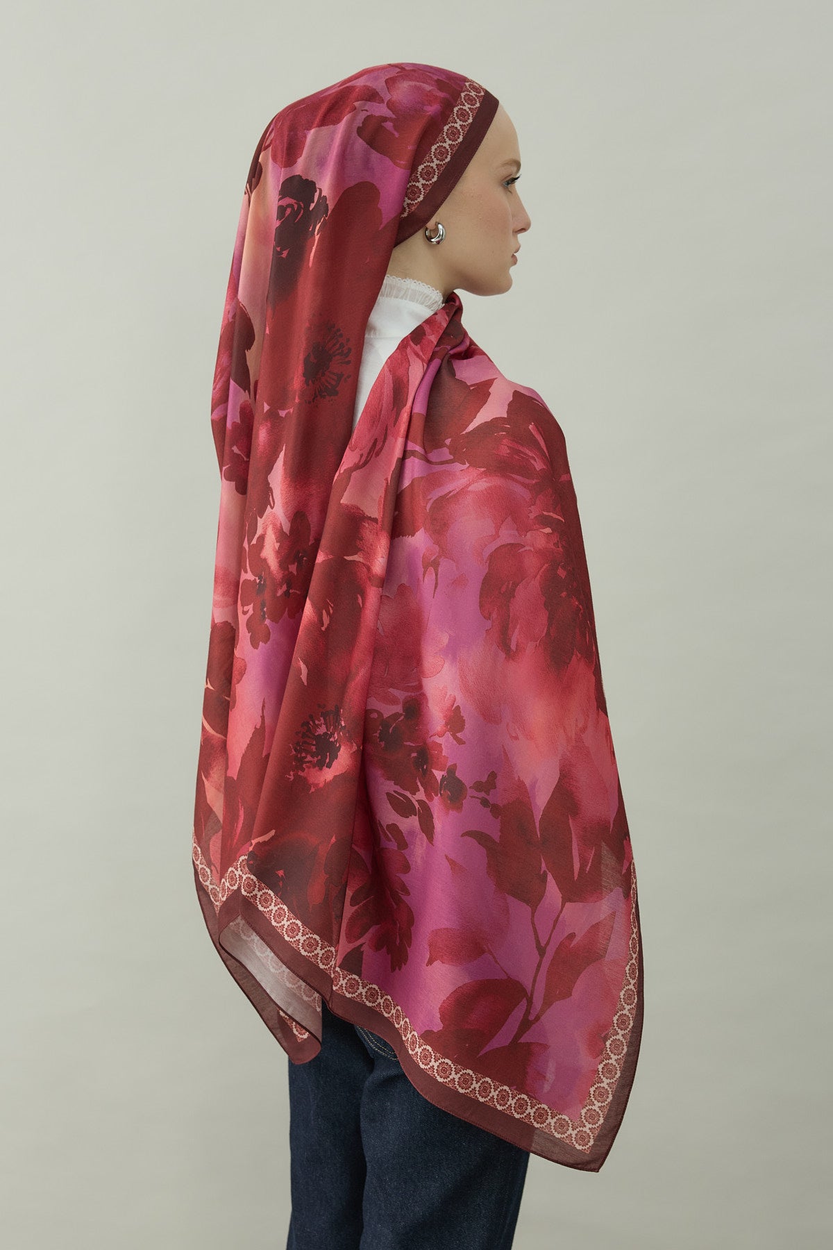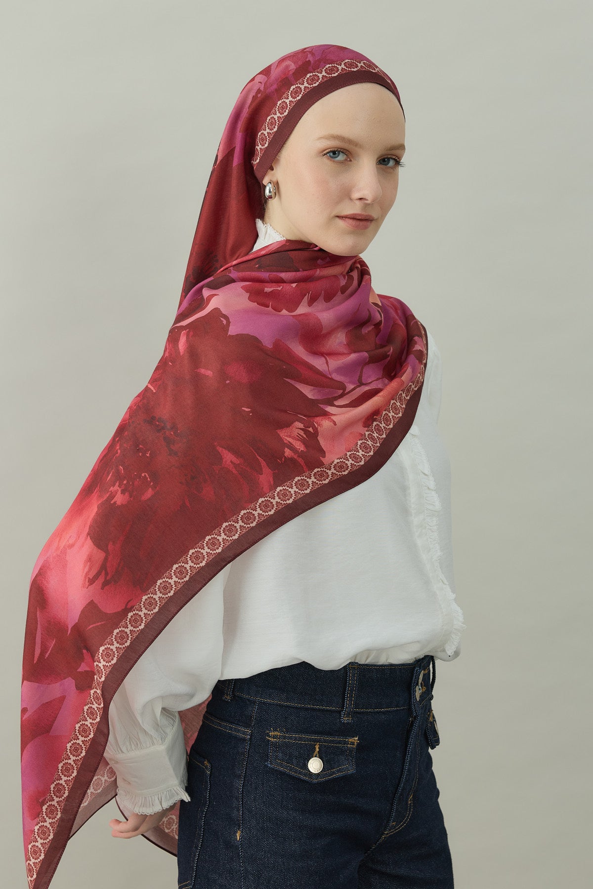 “Royal View” serisi, bir kraliyet sarayının çiçeklerle çevrili bahçesinde gezinen bir şıklığı temsil eder. Bu özel vişne ton sokak ve davet stilinize aristokrat bir duruş kazandırır; tıpkı sabahın ilk ışığıyla parlayan kırmızı-vişne çiçeklerin şal üzerindeki hâli gibidir.