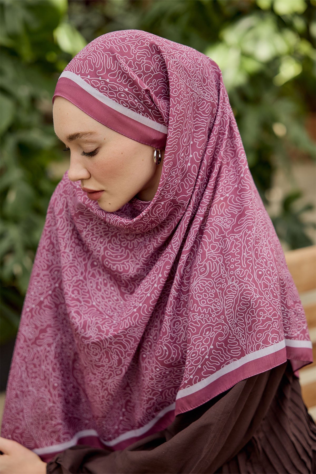 Confor Desen Şal – Ahududu, sadece bir şal değil; ahududu tonunun canlılığı, desenin özgün ritmi ve kumaşın pratikliği ile kombinlerinize renk ve karakter katar.