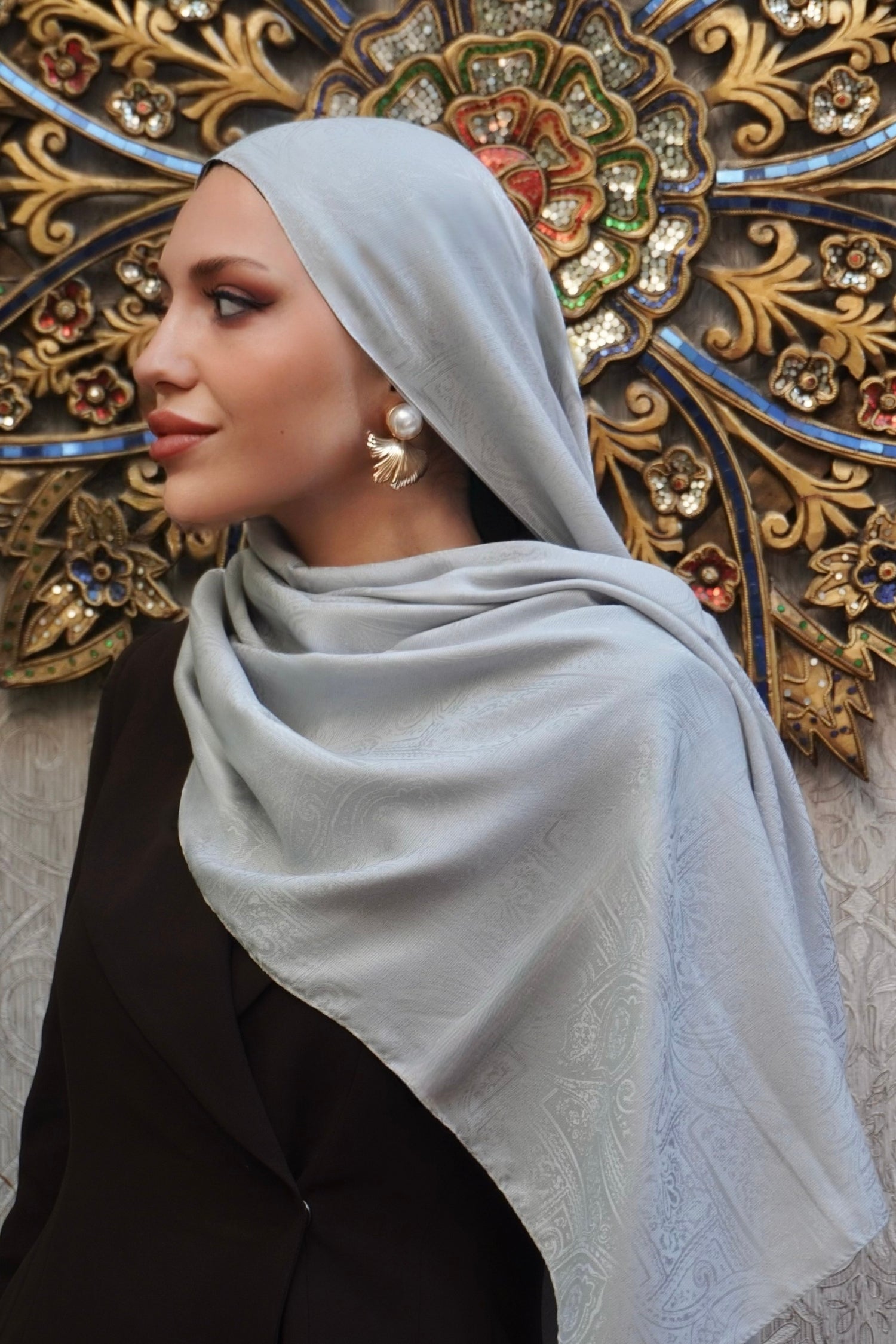 Bu kombinle etnik monogram desenli gümüş gri şal, nötr ve şehirli tonlarla birleşerek modern, dengeli ve zarif bir günlük ve ofis kombini oluşturur; gün boyu hem şıklık hem de konfor sunar.