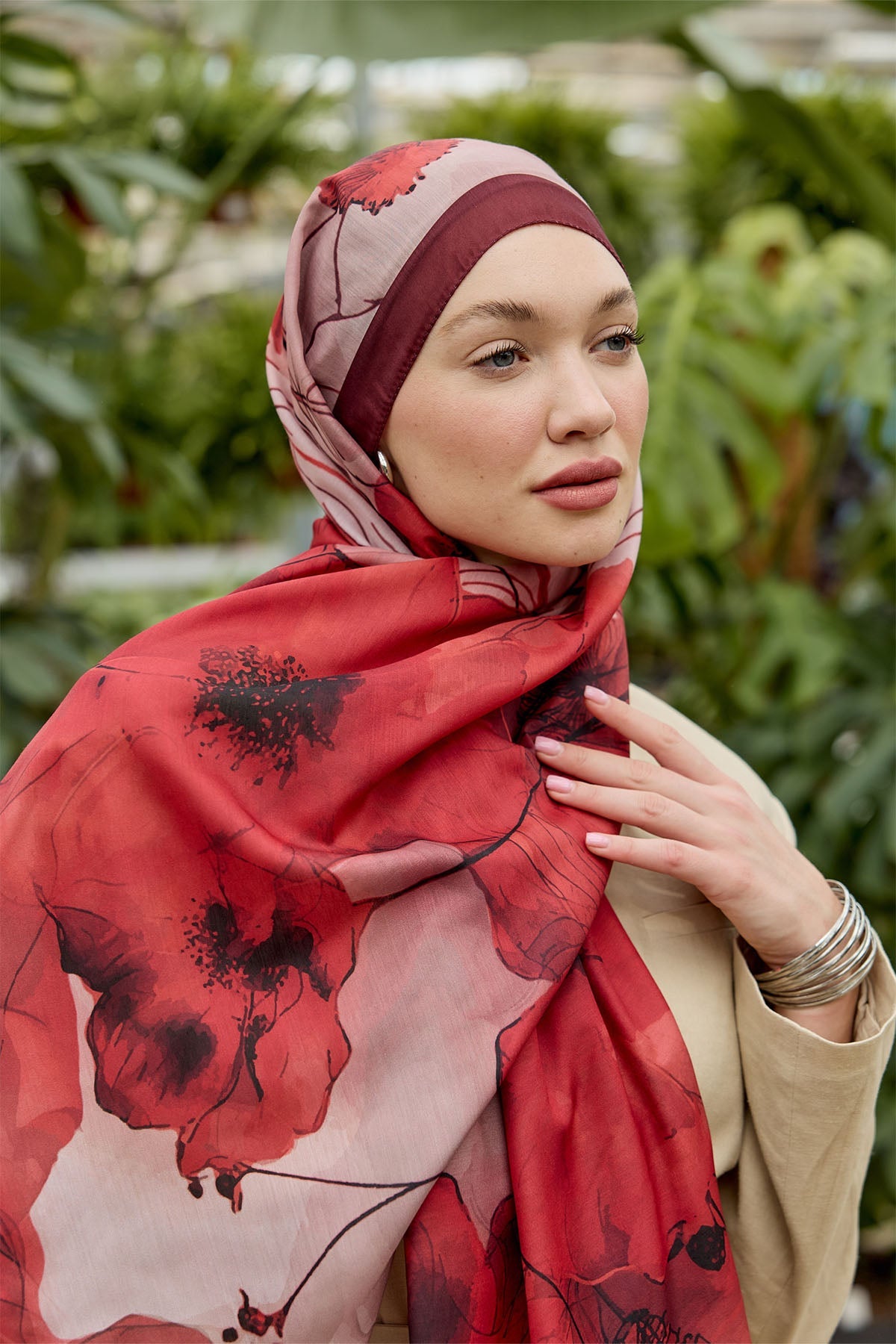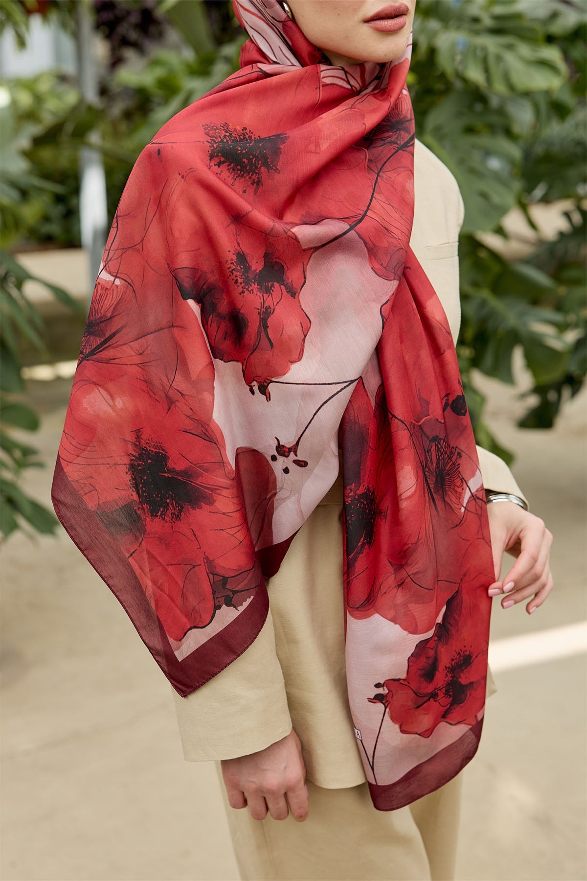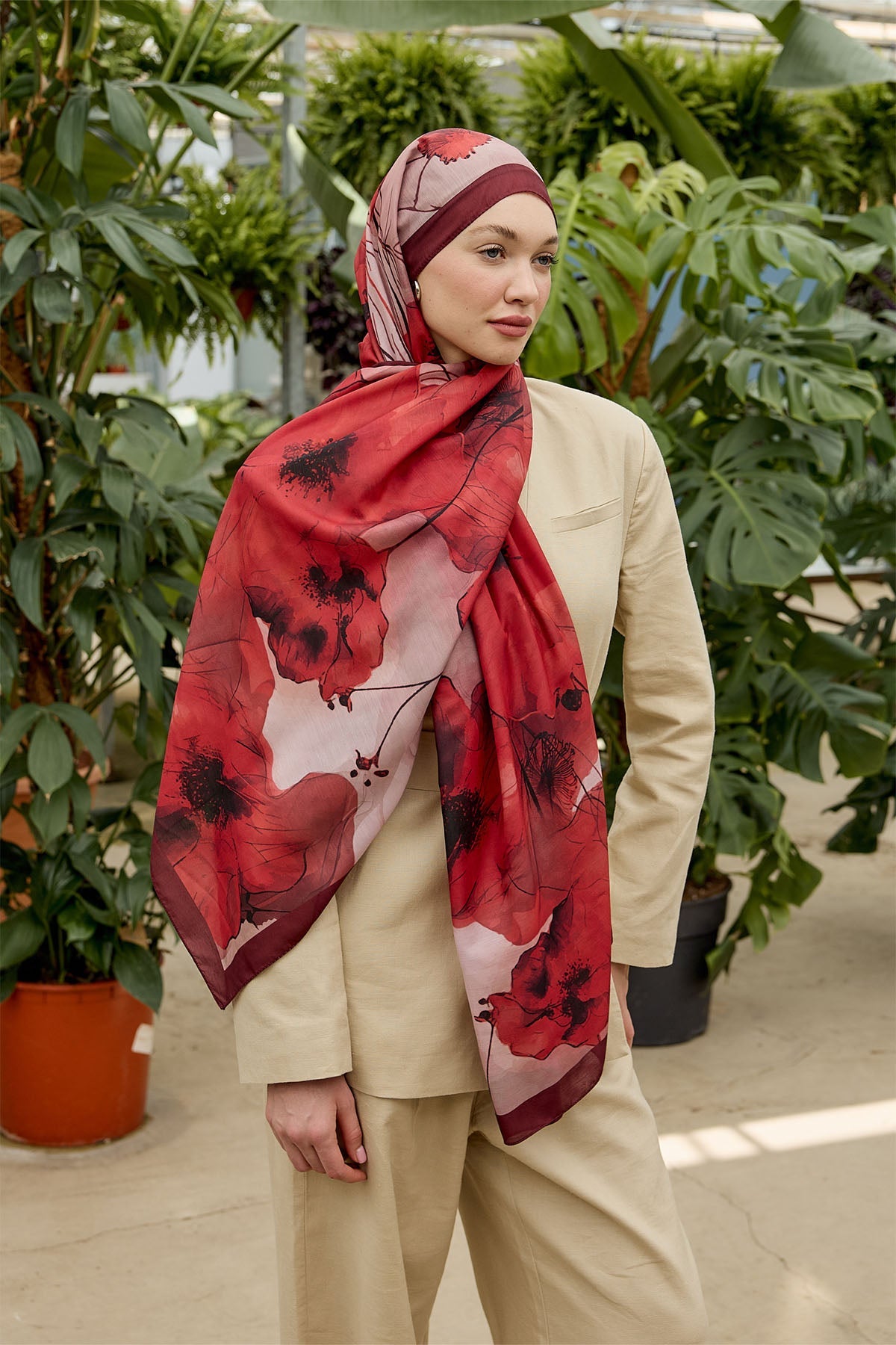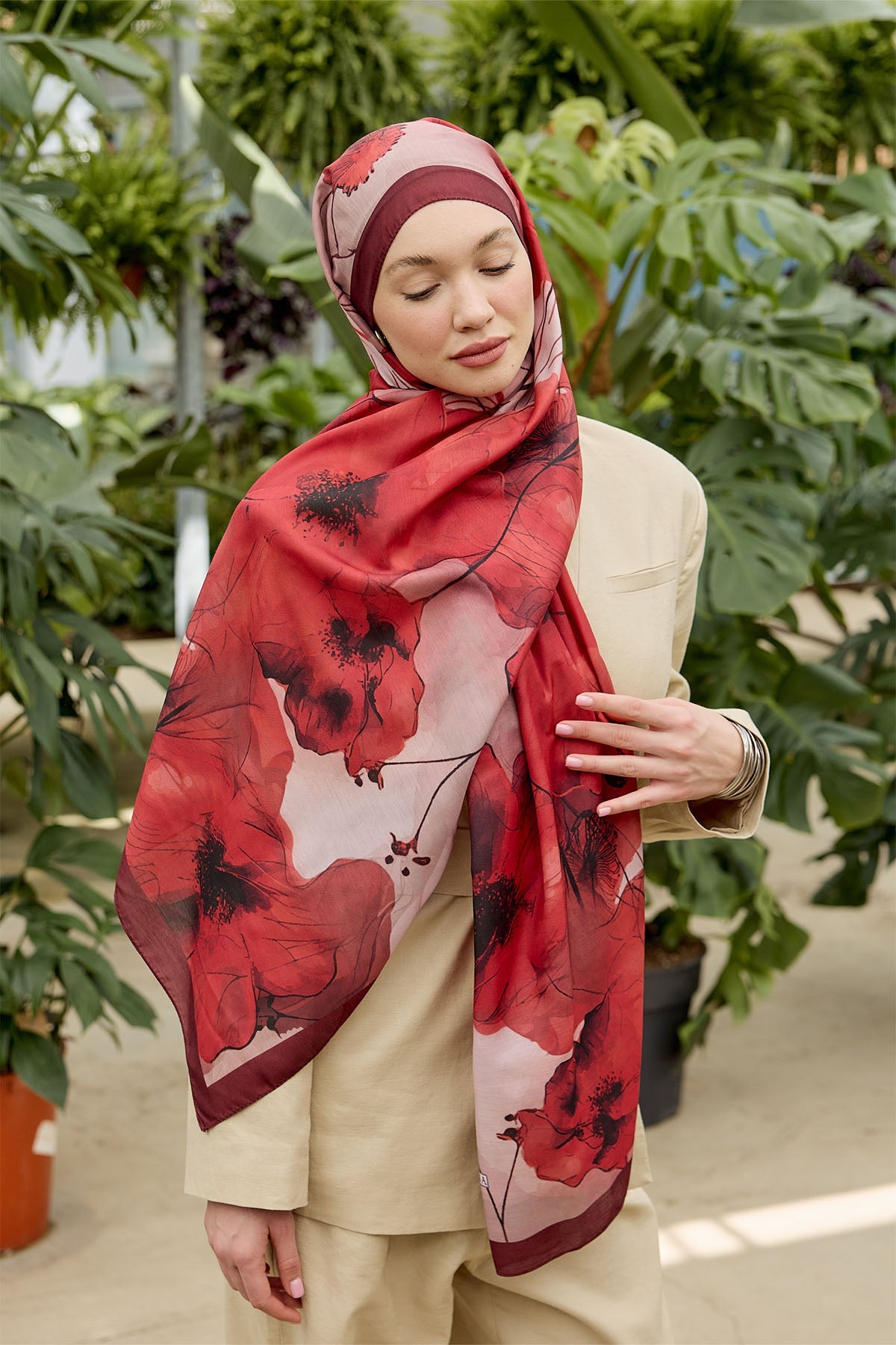 Garden Bloom Desen Şal – Burgundy, sadece bir aksesuar değil; burgundy rengin zarif derinliği, çiçek desenin feminen enerjisi ve kumaşın modern karışımı ile stilinize karakter katıyor.