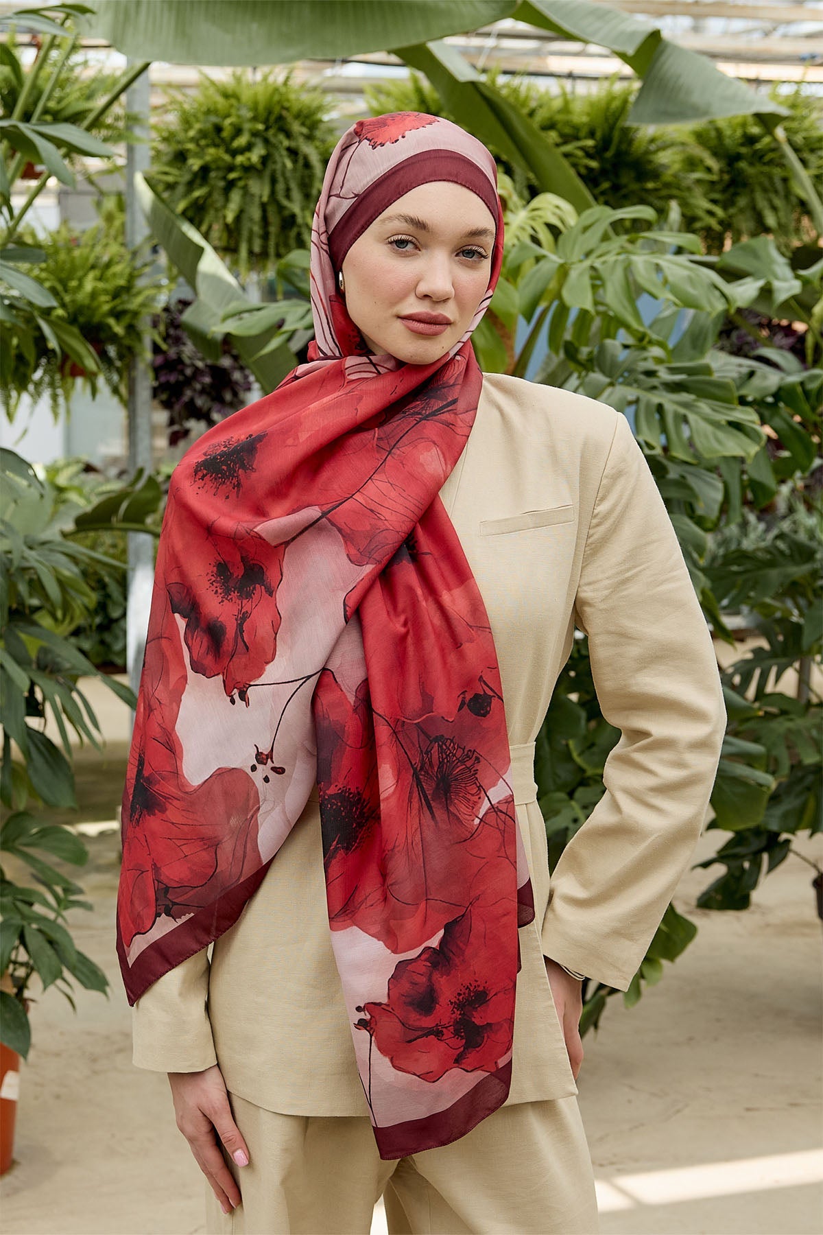 Garden Bloom Desen Şal – Burgundy, derin bordo-mor tonunun çiçek desenleriyle buluştuğu şık bir parça. Bu renk, zarafet ve tazelik arasında güçlü bir denge kurarken “Garden Bloom” motifleri ile stilinize sıcak ama karakterli bir dokunuş katıyor.