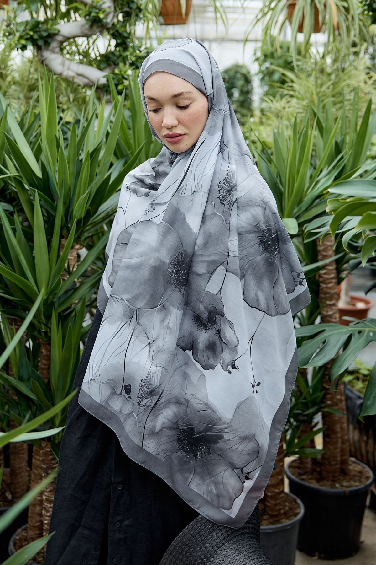 Garden Bloom Desen Şal – Gri, sadece bir aksesuar değil; gri rengin sınıfı, çiçek desenlerin zarafeti ve kumaşın kullanım kolaylığı ile bir araya gelen bir stil ifadesidir.