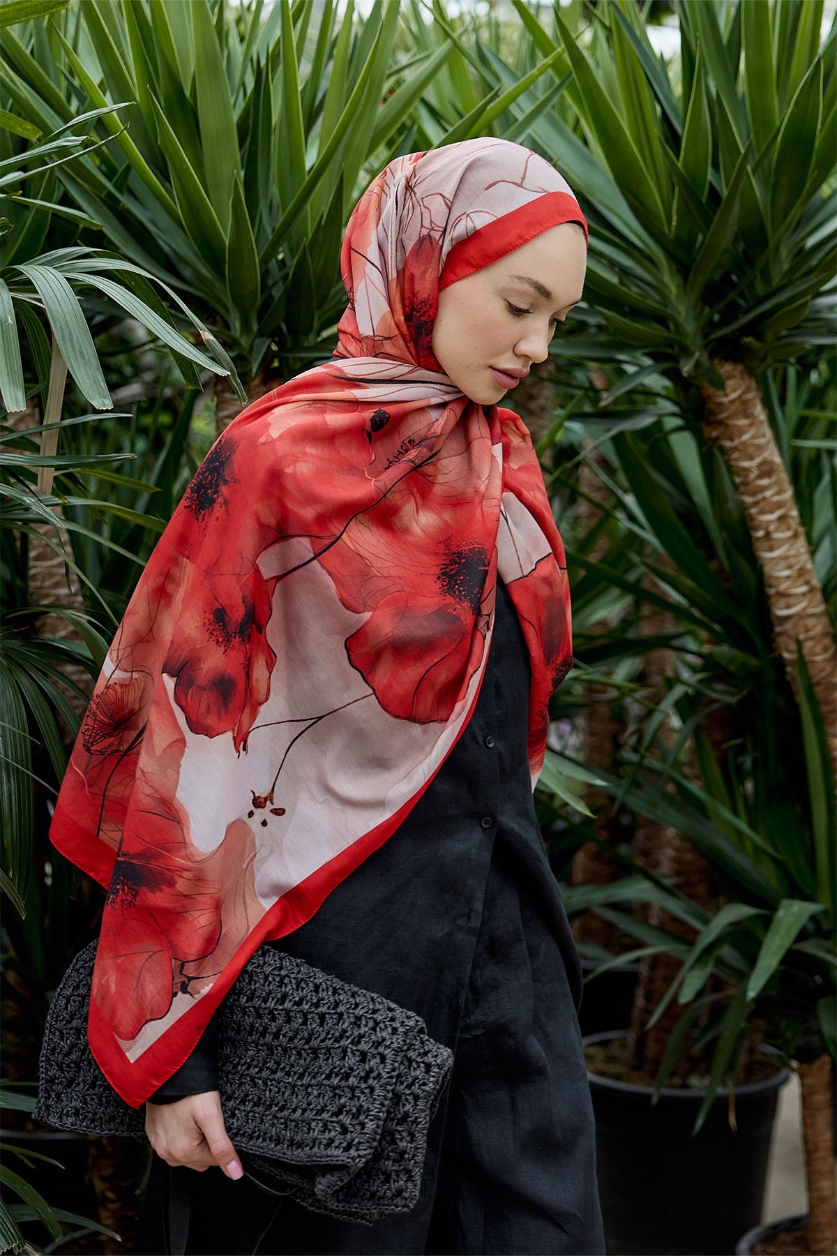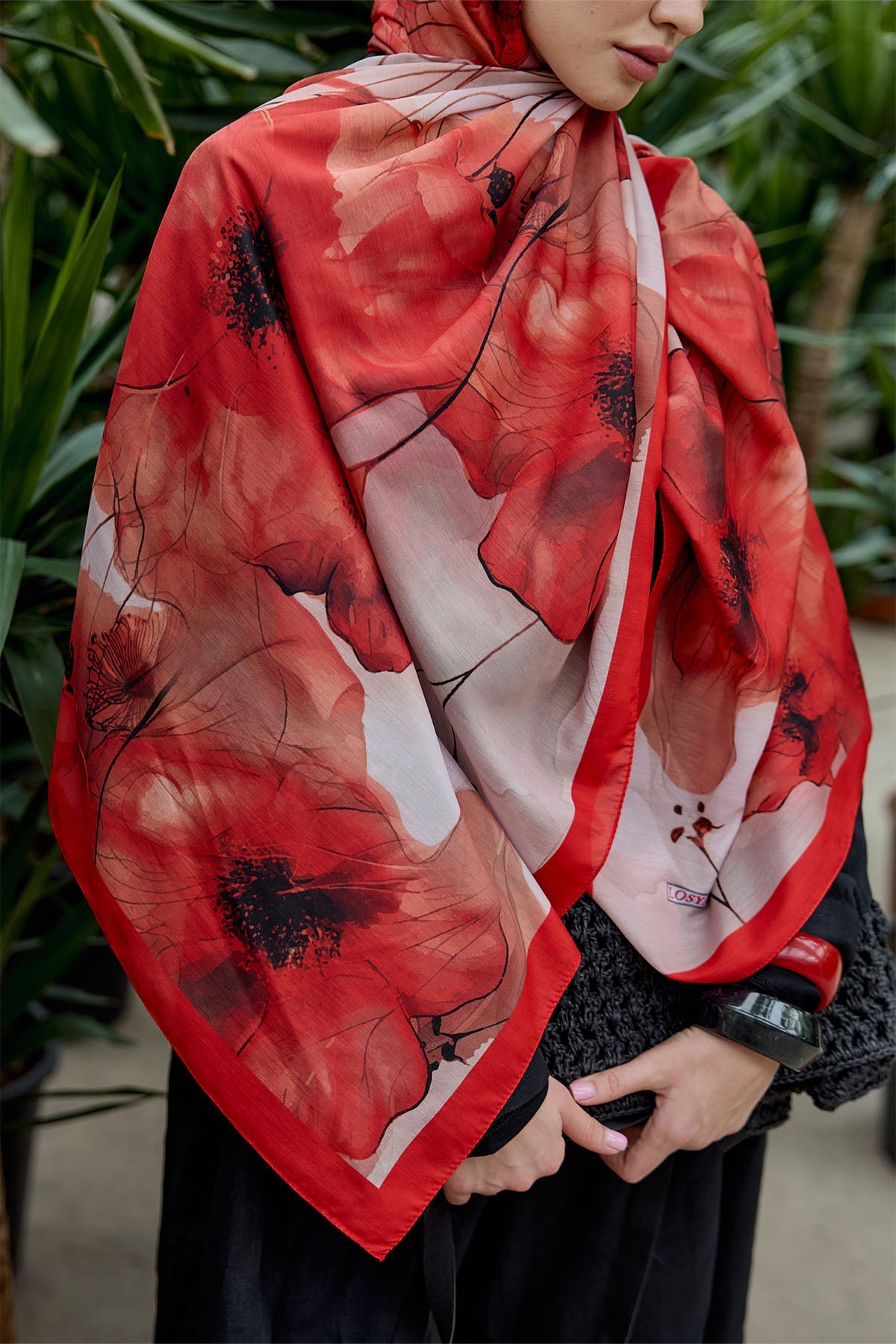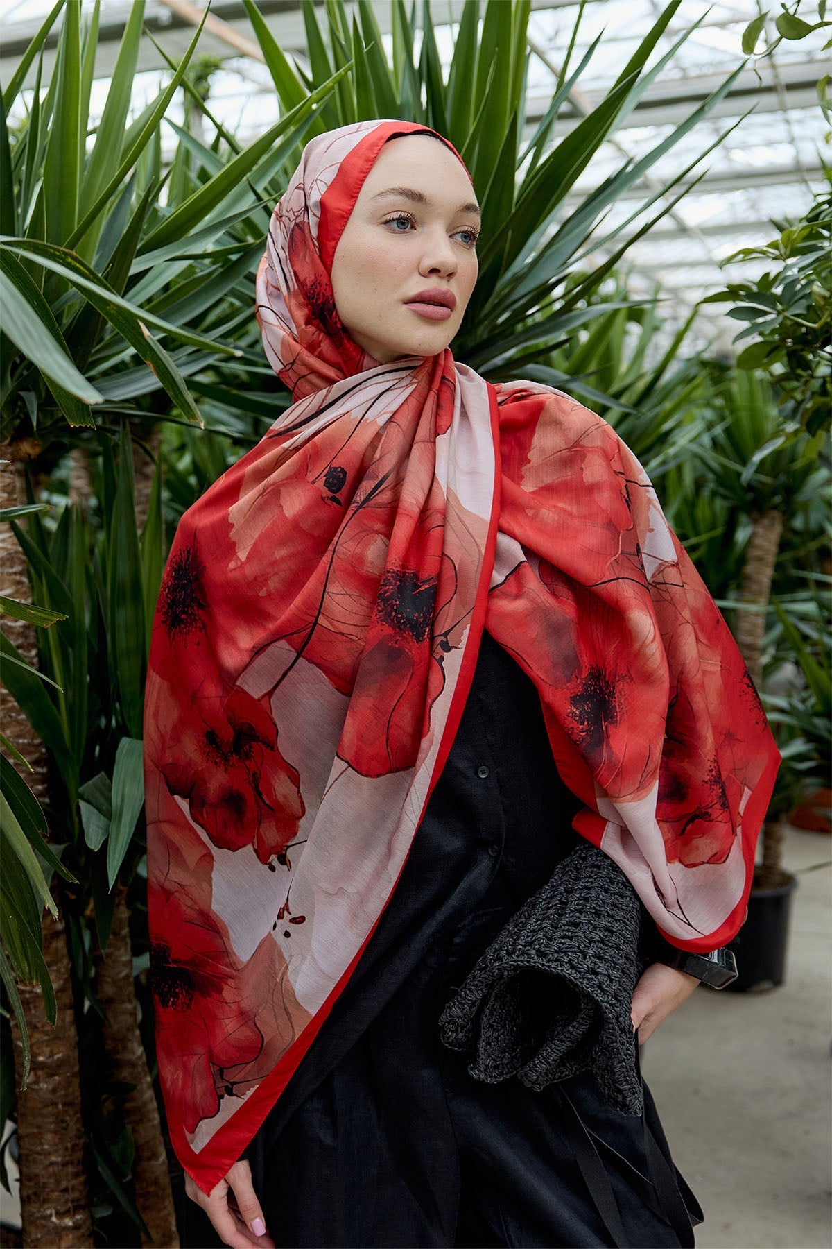 Garden Bloom Desen Şal – Kırmızı, sadece bir aksesuar değil; kırmızı rengin cesareti, çiçek desenlerin romantizmi ve kumaşın konforu ile bir araya gelen stil dolu bir ifade.