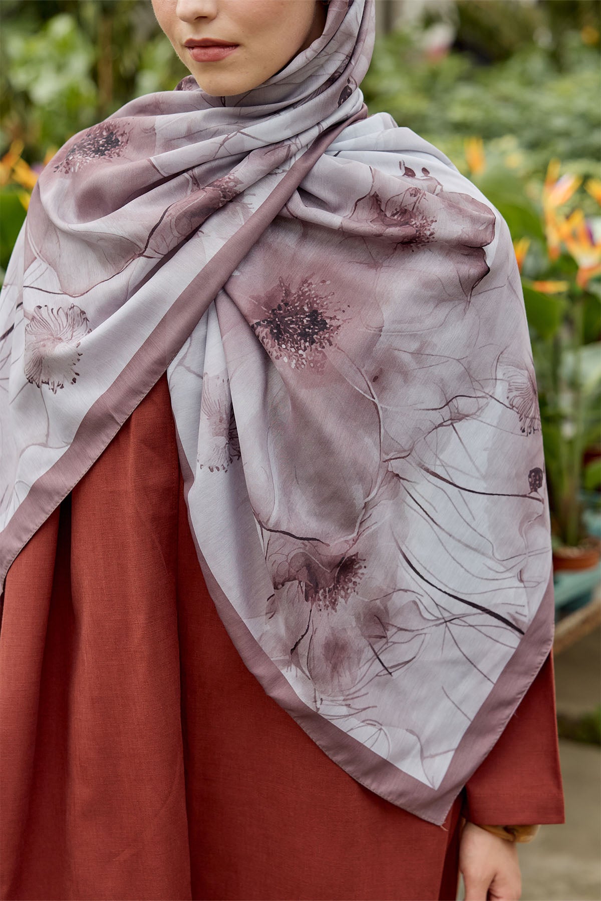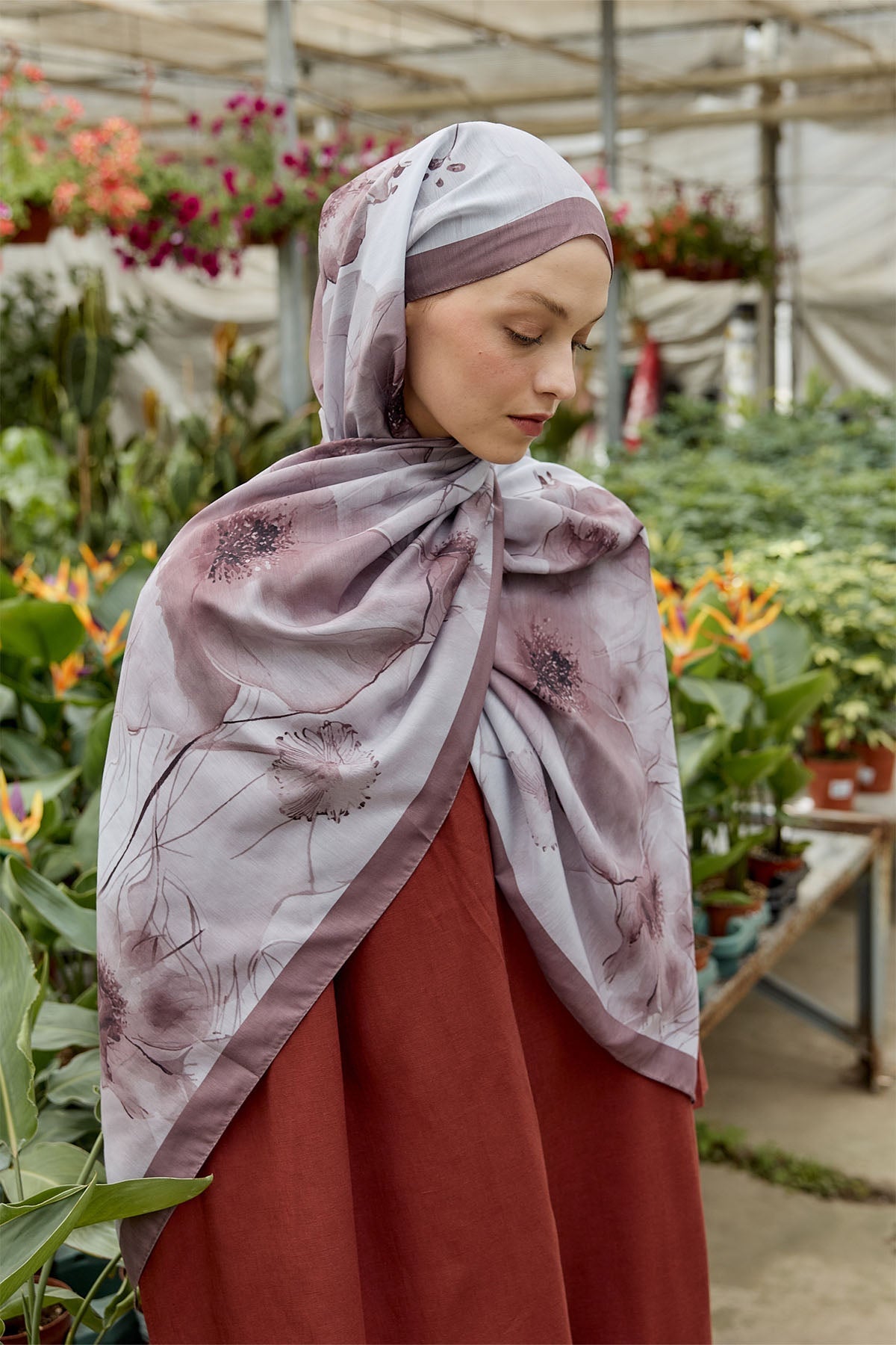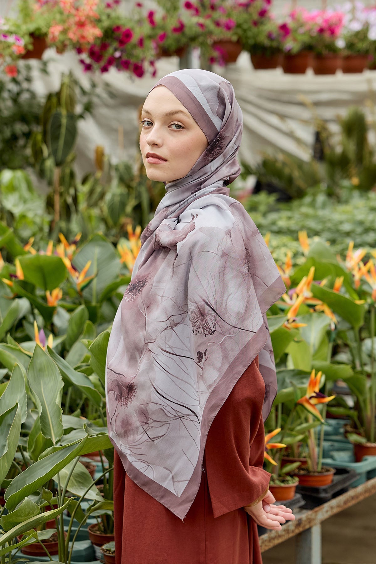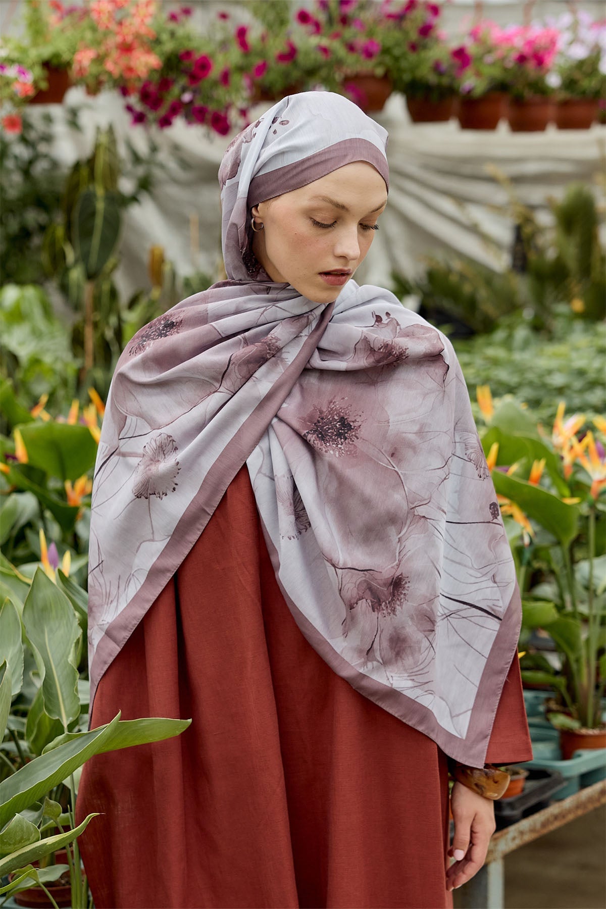 Garden Bloom Desen Şal – Mauve, pastel mauve tonunun romantik zarafetini ve çiçek desenlerinin estetik akışını bir arada sunar. Bu şal, soft mor-gri yapısıyla hem sade şıklığı yakalamak isteyenler için hem de dikkat çekici bir detayı arayanlar için muazzam bir seçim.