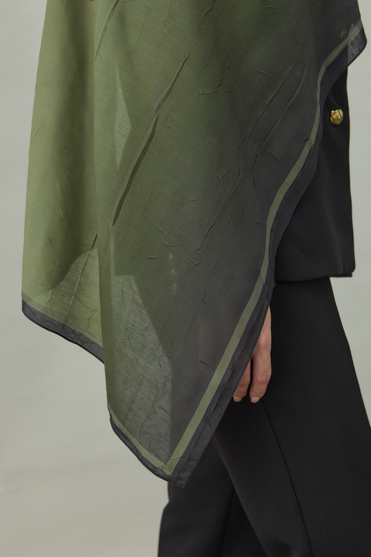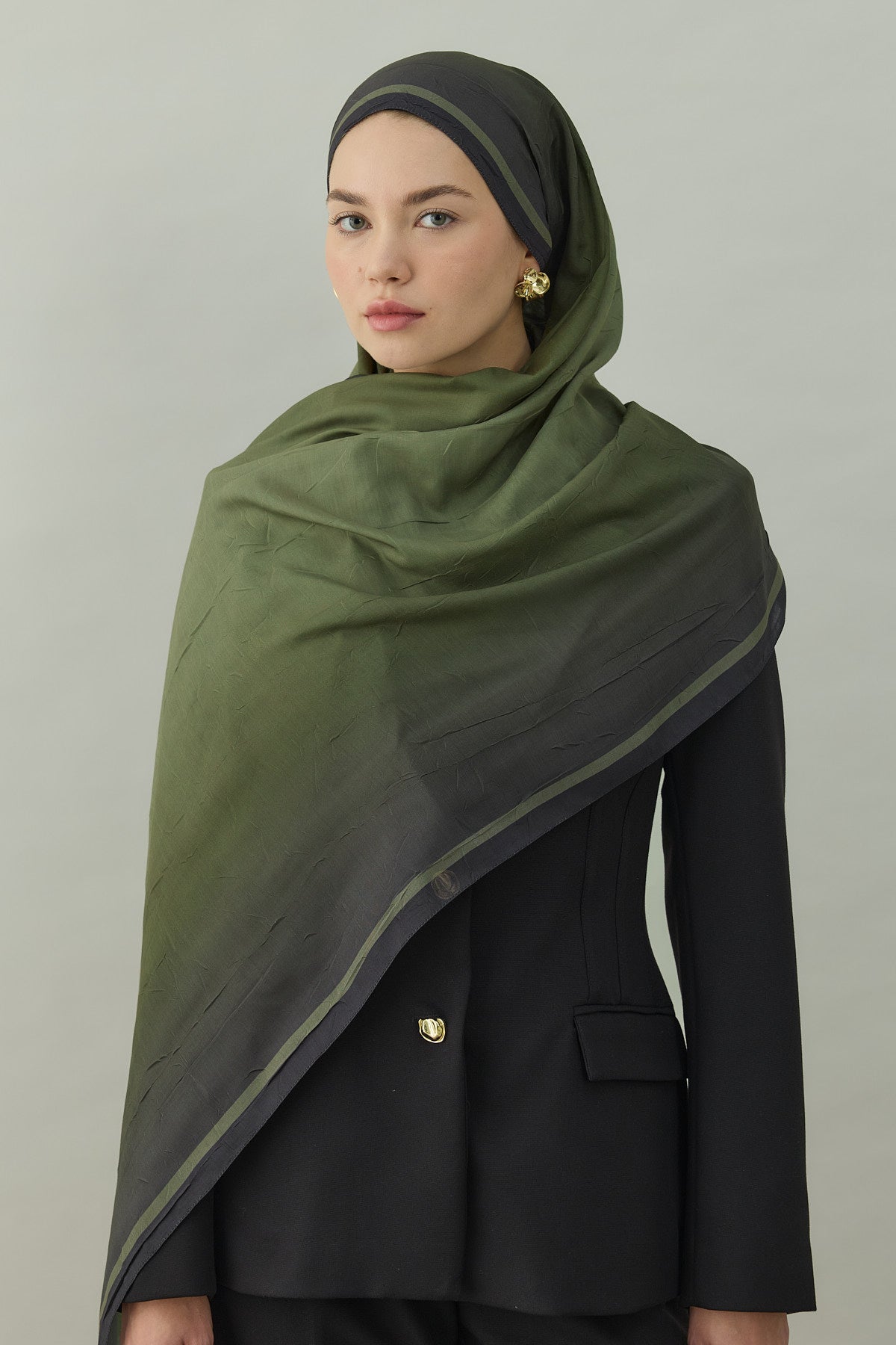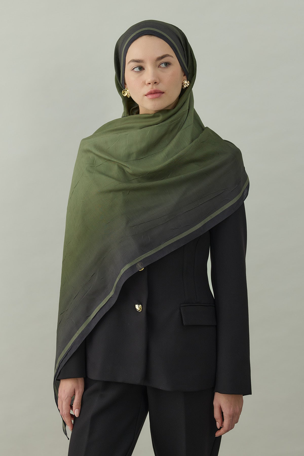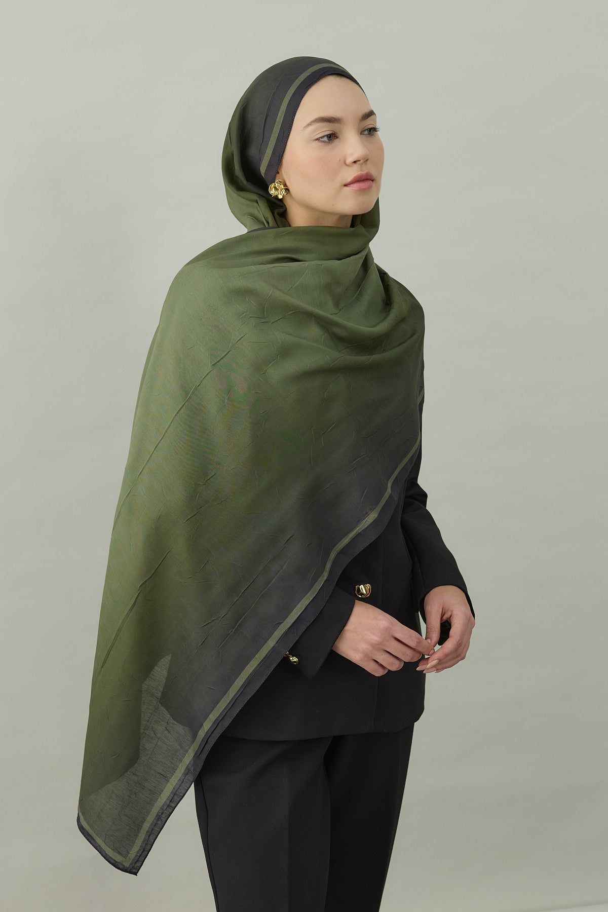 Bu görünümde Kras Aura Degrade Desen Şal Haki, hem ütü gerektirmeyen pratik dokusuyla hem de doğal haki degrade tonlarıyla profesyonel, şehirli ve sofistike bir tesettür şal kombini sunar.
