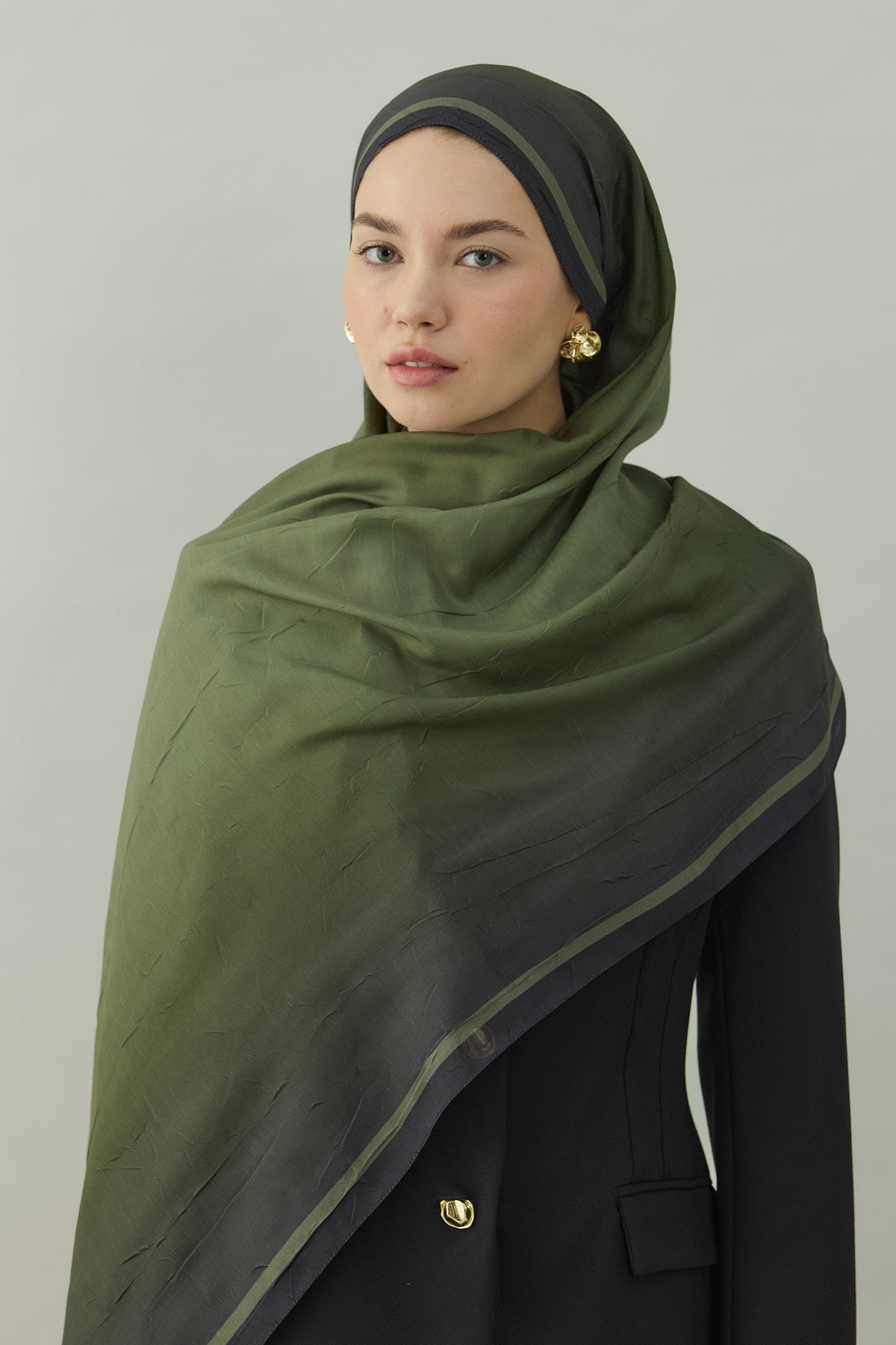 Bu kombinle haki degrade crash şal, doğal ve toprak tonlarla birleşerek modern, dengeli ve zarif bir günlük tesettür kombini ortaya çıkarır.