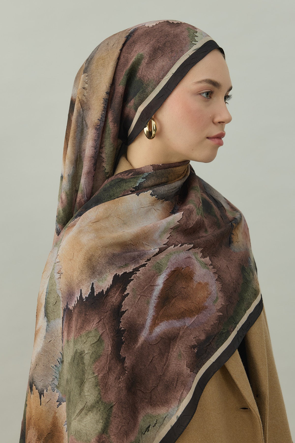 Bu kombinle haki ebruli crash şal, toprak ve nötr tonlarla birleşerek modern, dengeli ve zarif bir günlük tesettür kombini ortaya çıkarır.