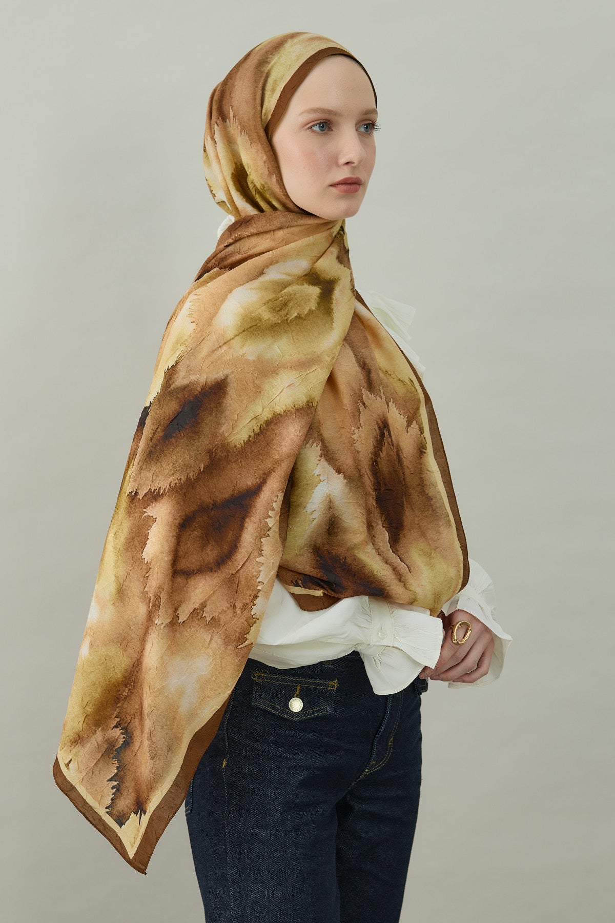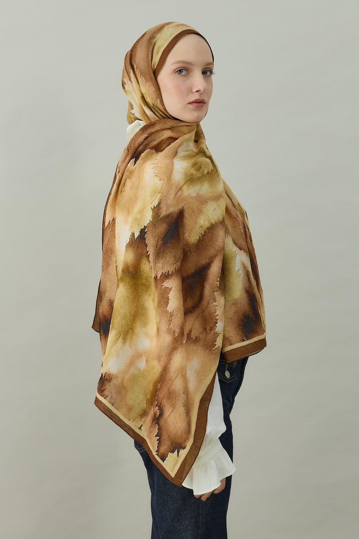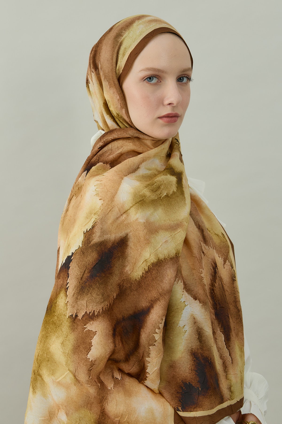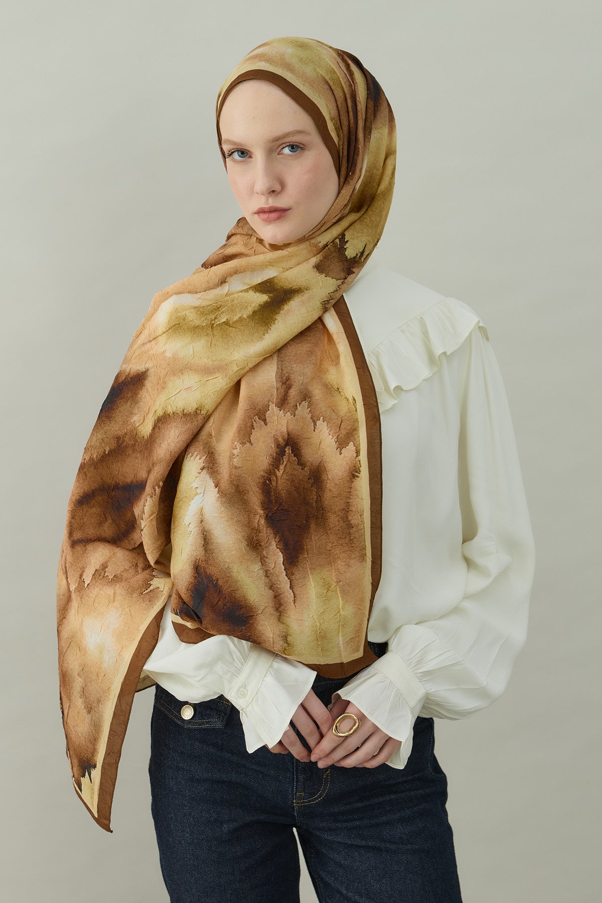 Bu görünümde Kras Ebruli Desen Şal Sahra, hem ütü gerektirmeyen pratik dokusuyla hem de doğal sahra tonlarıyla profesyonel, elegan ve şehirli bir tesettür şal kombini sunar.