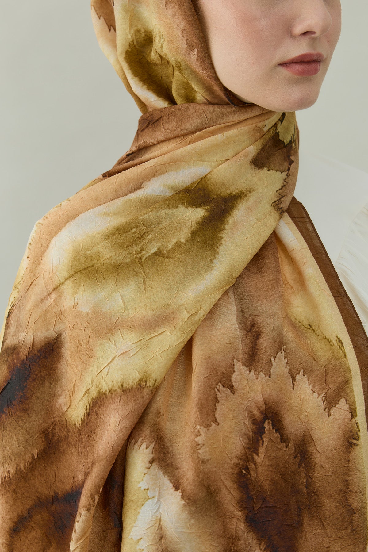 Kras Ebruli desen şal sahra, ütü gerektirmeyen crash dokusu ve doğal ebruli sahra tonları ile hem pratik hem de çok şık bir stil sunar. Kendiliğinden kırışık yapısı sayesinde gün boyu doğal, şekilli ve hacimli durur; böylece “özenli ama uğraşılmamış” görünümü zahmetsizce yakalarsınız. Sıcak sahra / kum bej tonlarının ebruli geçişi, sade kombinlere derinlik ve zarif bir yumuşaklık katar; günlük şehir stilinden ofis şıklığına kadar pek çok kombine rahatlıkla uyum sağlar.