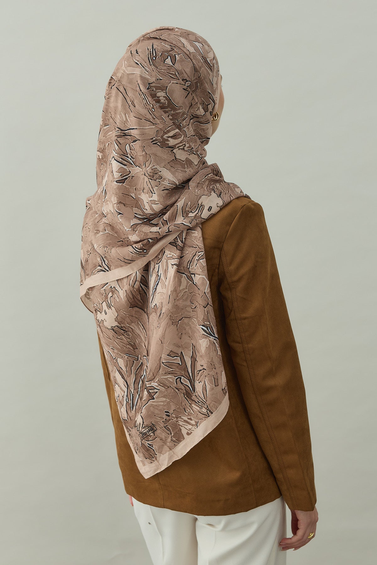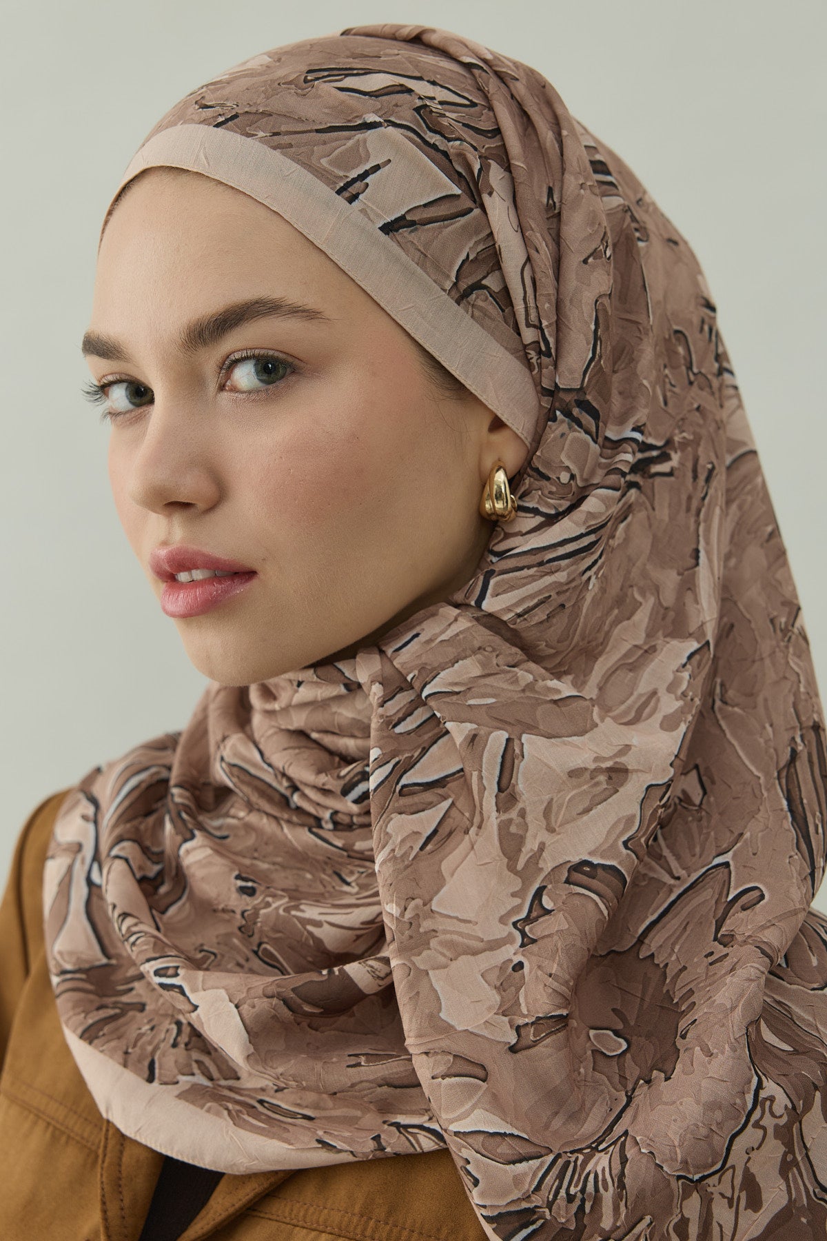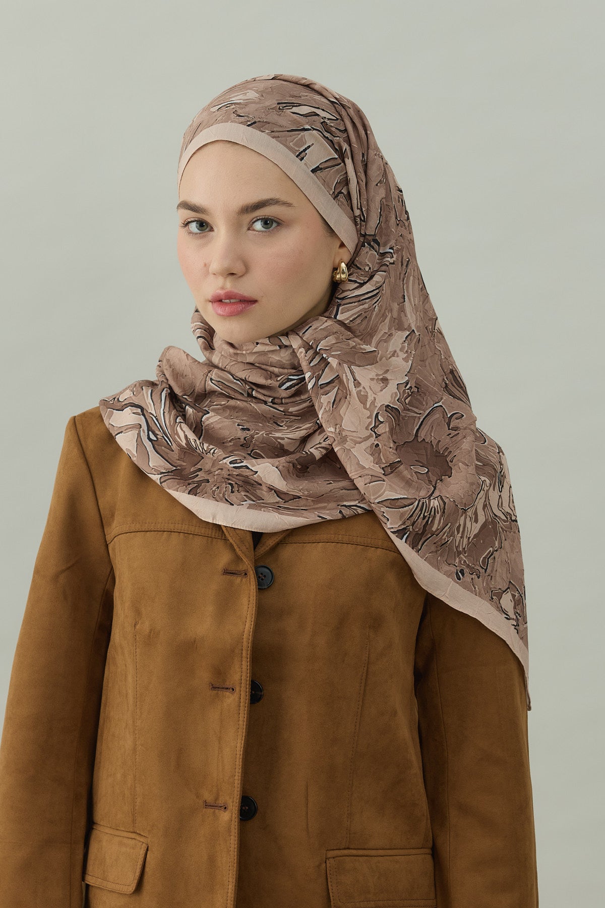 Bu kombinle krem çiçek desenli crash şal, soft ve toprak tonlarla birleşerek aydınlık, zarif ve modern bir günlük tesettür kombini oluşturur.