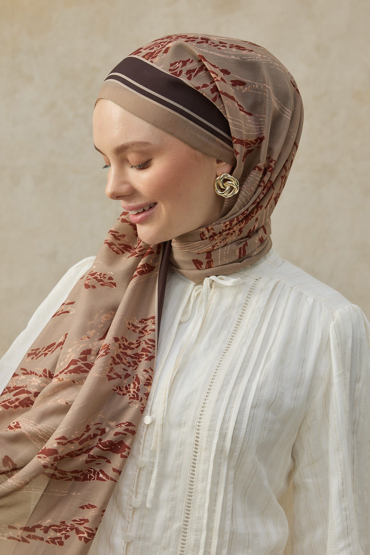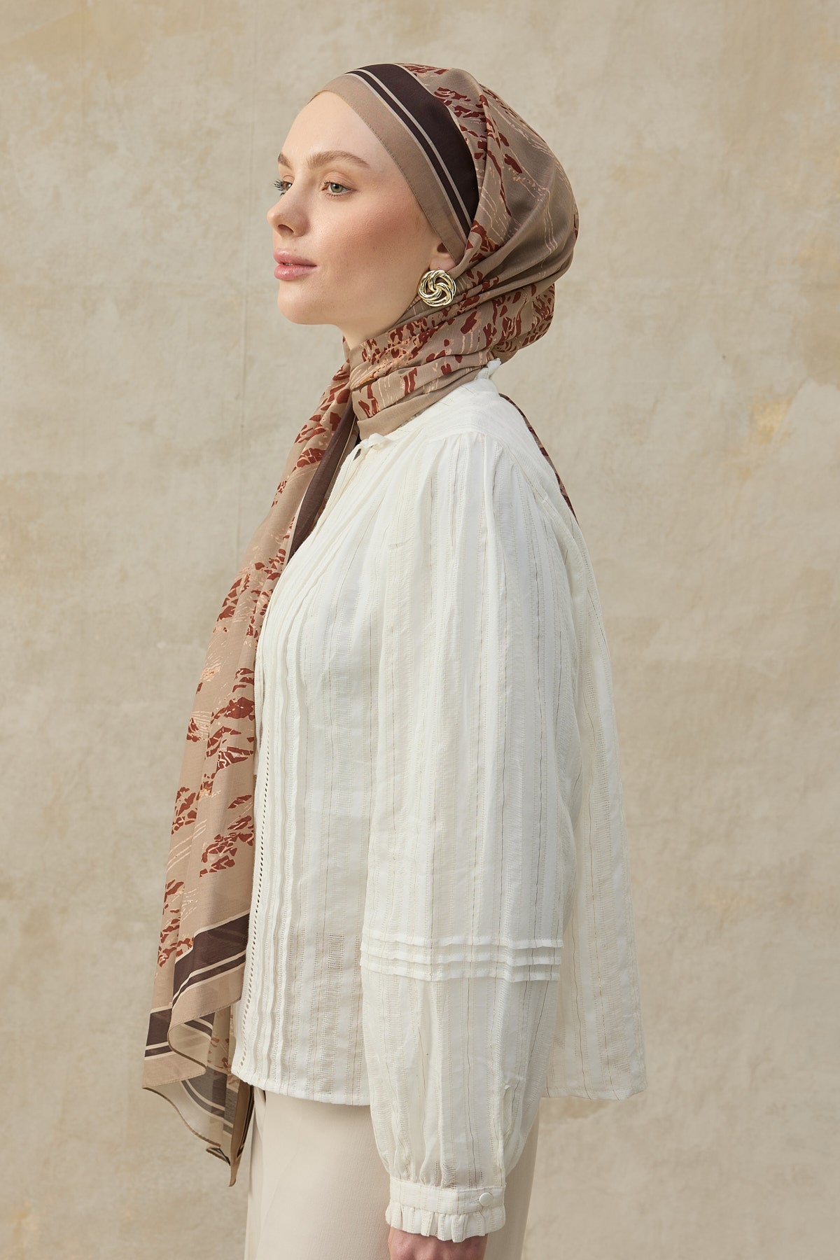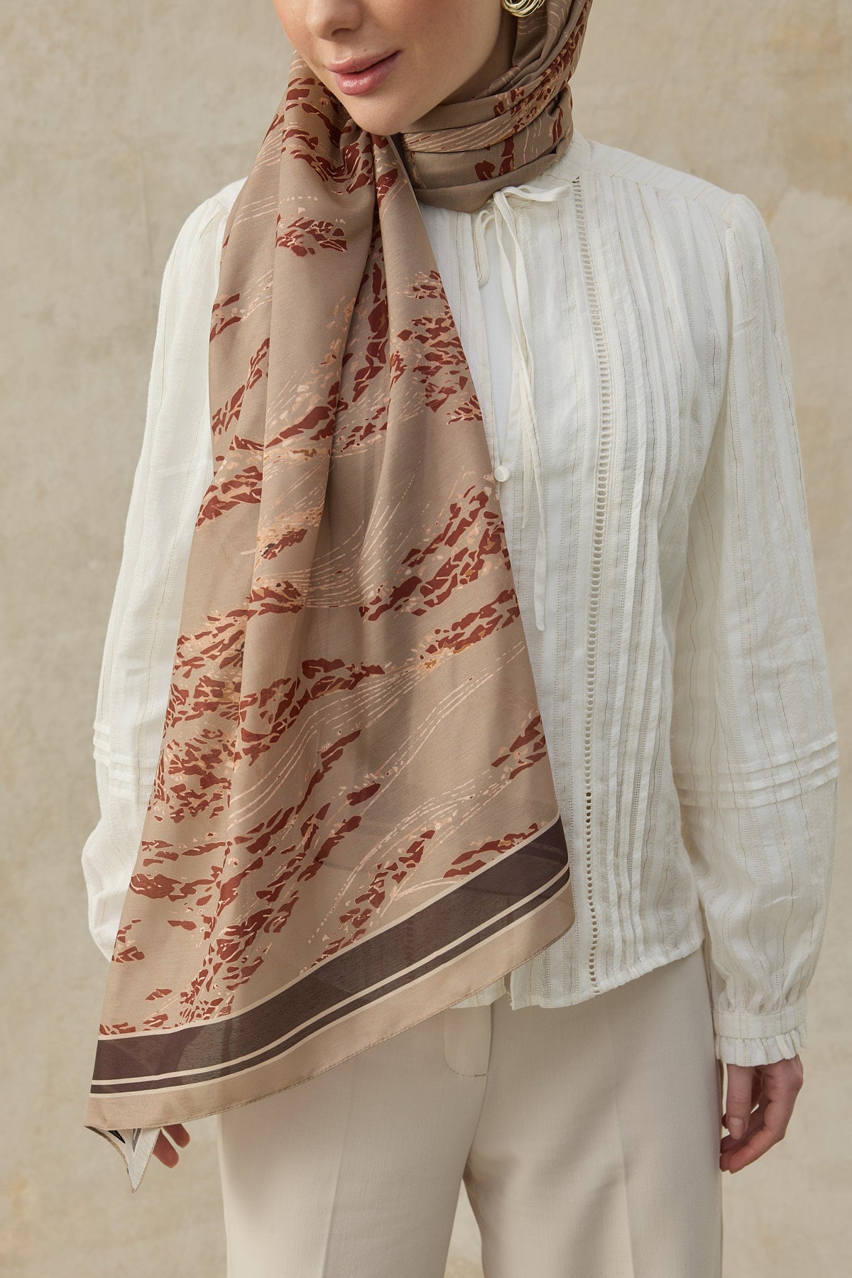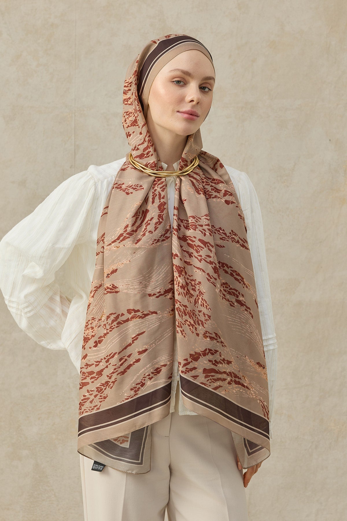 Modern şal modelleri, desenli şal, pamuklu şal ve ütü gerektirmeyen şal arayanlar için dikkat çeken bu tasarım, güçlü görünümü ve kullanım kolaylığıyla gardırobun sık tercih edilen parçalarından biri olmaya adaydır. Kombin Önerisi: Bu cappuccino şal modelini ekru gömlek, taş ya da kahve tonlarında pantolon ve sade altın tonlu aksesuarlarla tamamlayarak sıcak, dengeli ve etkileyici bir görünüm elde edebilirsiniz.