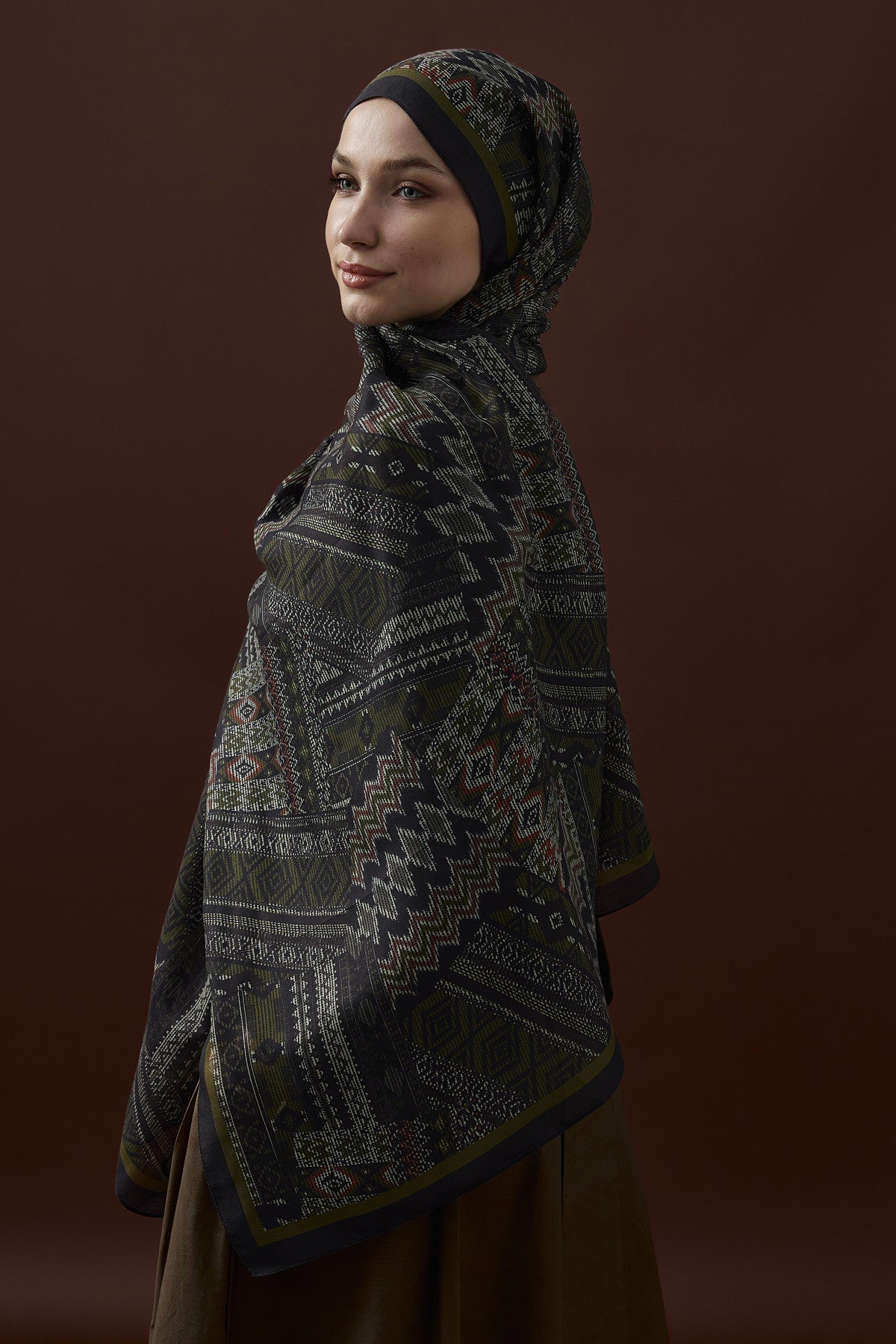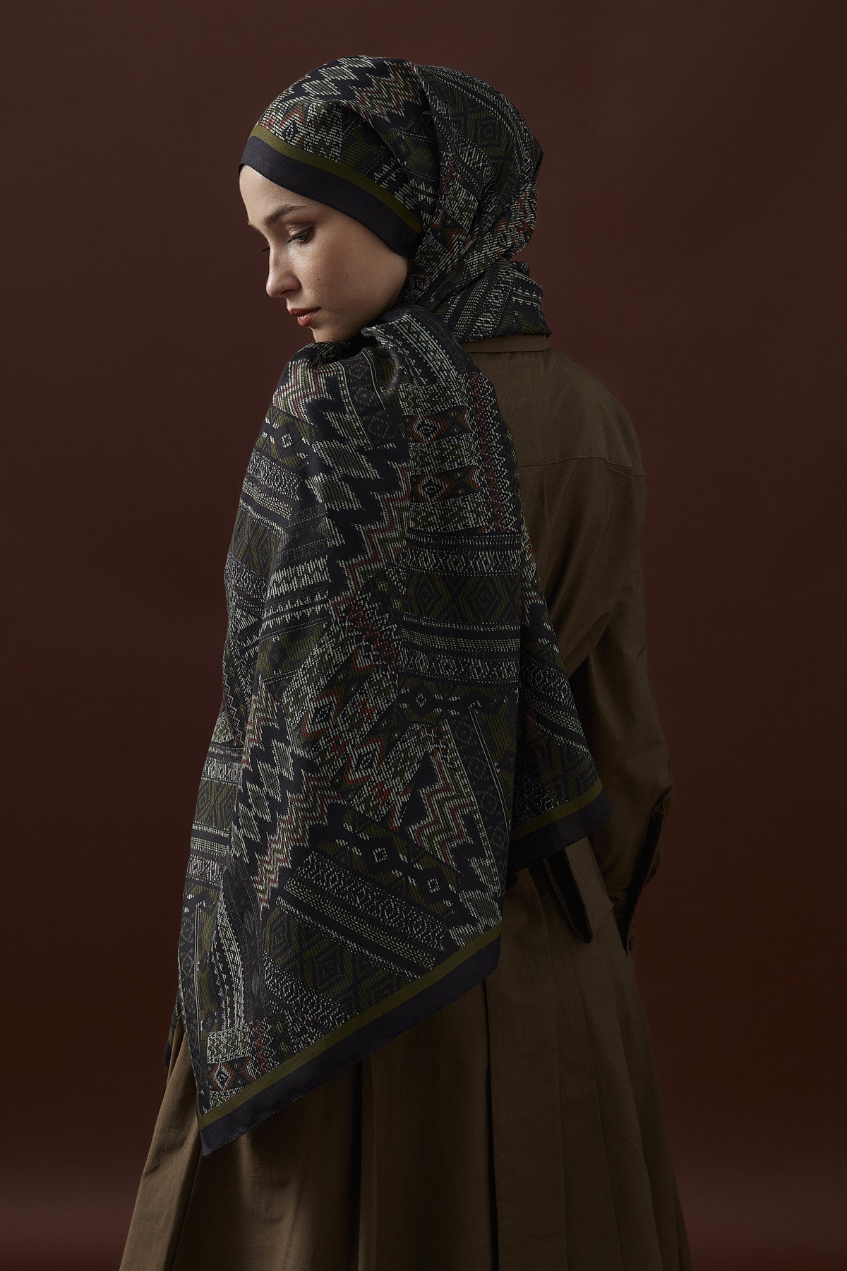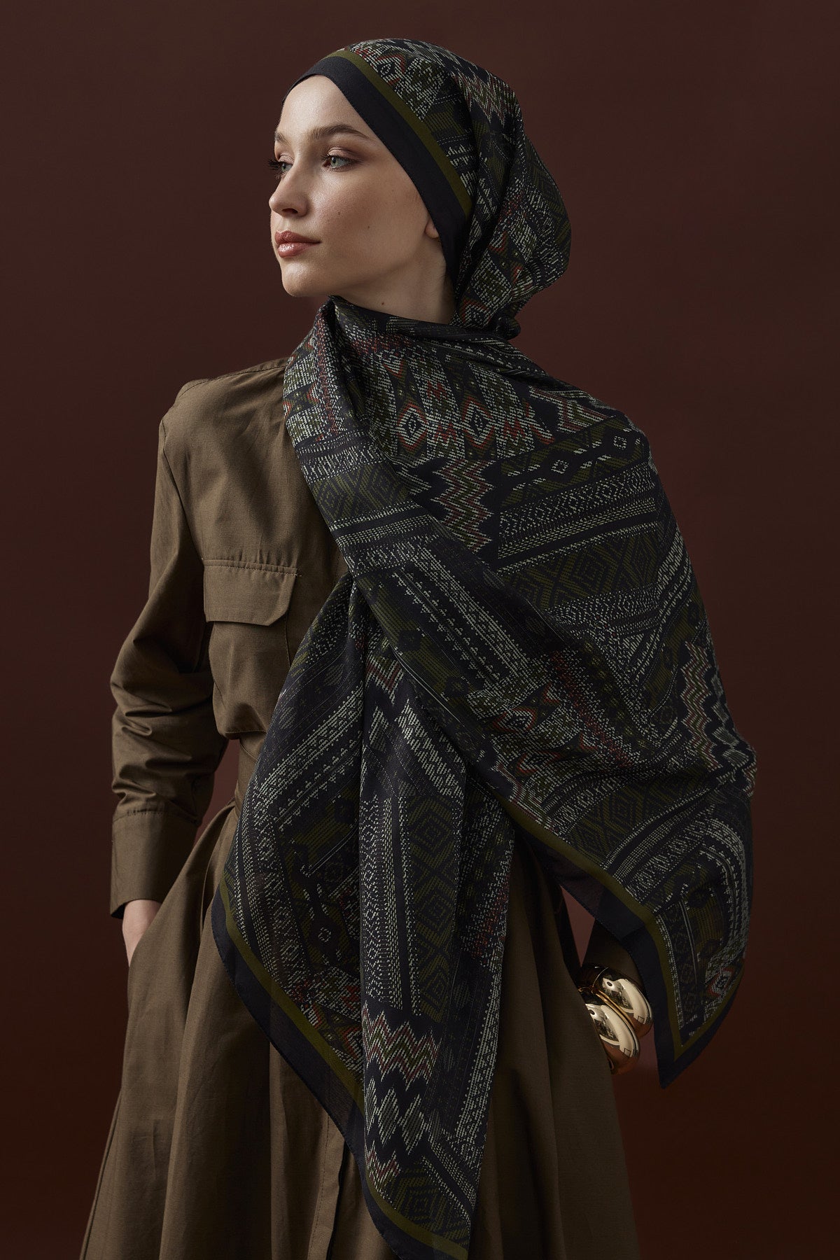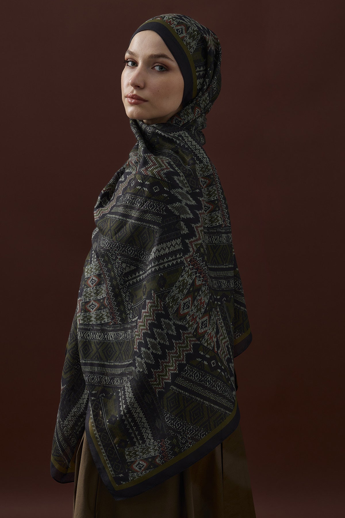 Winter Echoes Anatolian Loop Desen Şal – Haki, doğanın sakin tonlarını ve Anadolu'nun geleneksel ilmek desenlerini modern bir dokunuşla buluşturur. Hem günlük şıklığı hem de özel davetlerdeki zarafeti yansıtan bu şal, her mevsime uyum sağlayan tasarımıyla dikkat çeker.