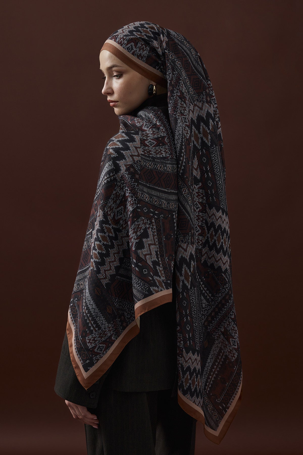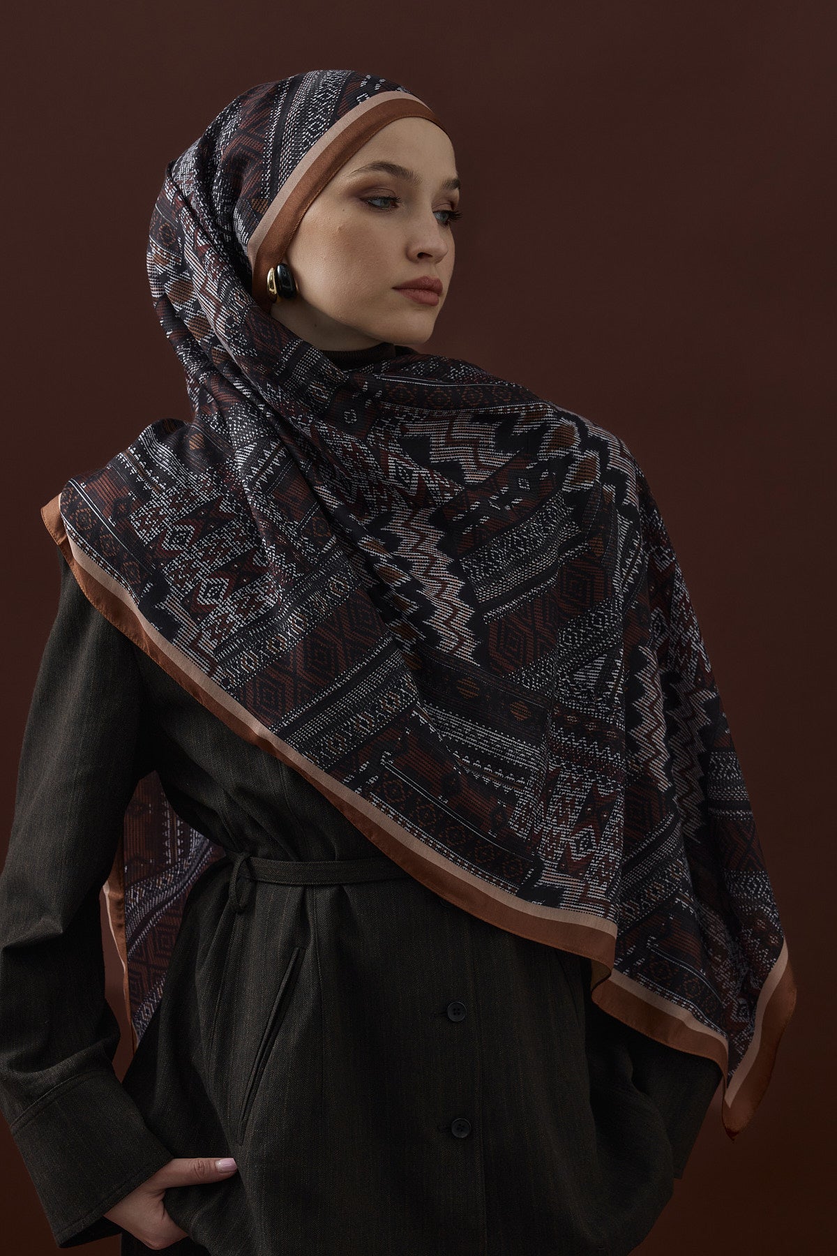 Winter Echoes Anatolian Loop Desen Şal – Kahverengi, doğal kahverengi tonlarıyla zamansız bir şıklık sunar. Anadolu'nun geleneksel ilmek motiflerini modern bir dokunuşla harmanlayan bu şal, zarif ve sofistike bir stil arayanlar için idealdir.