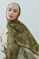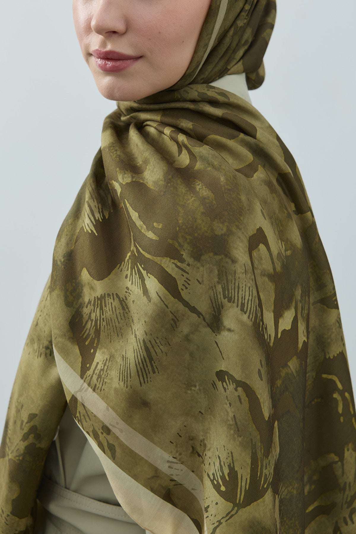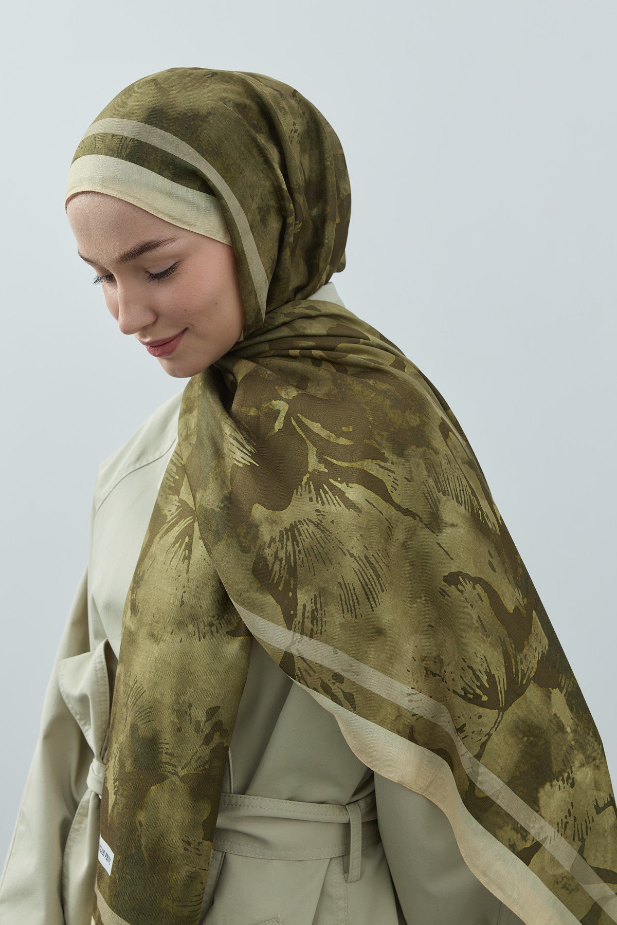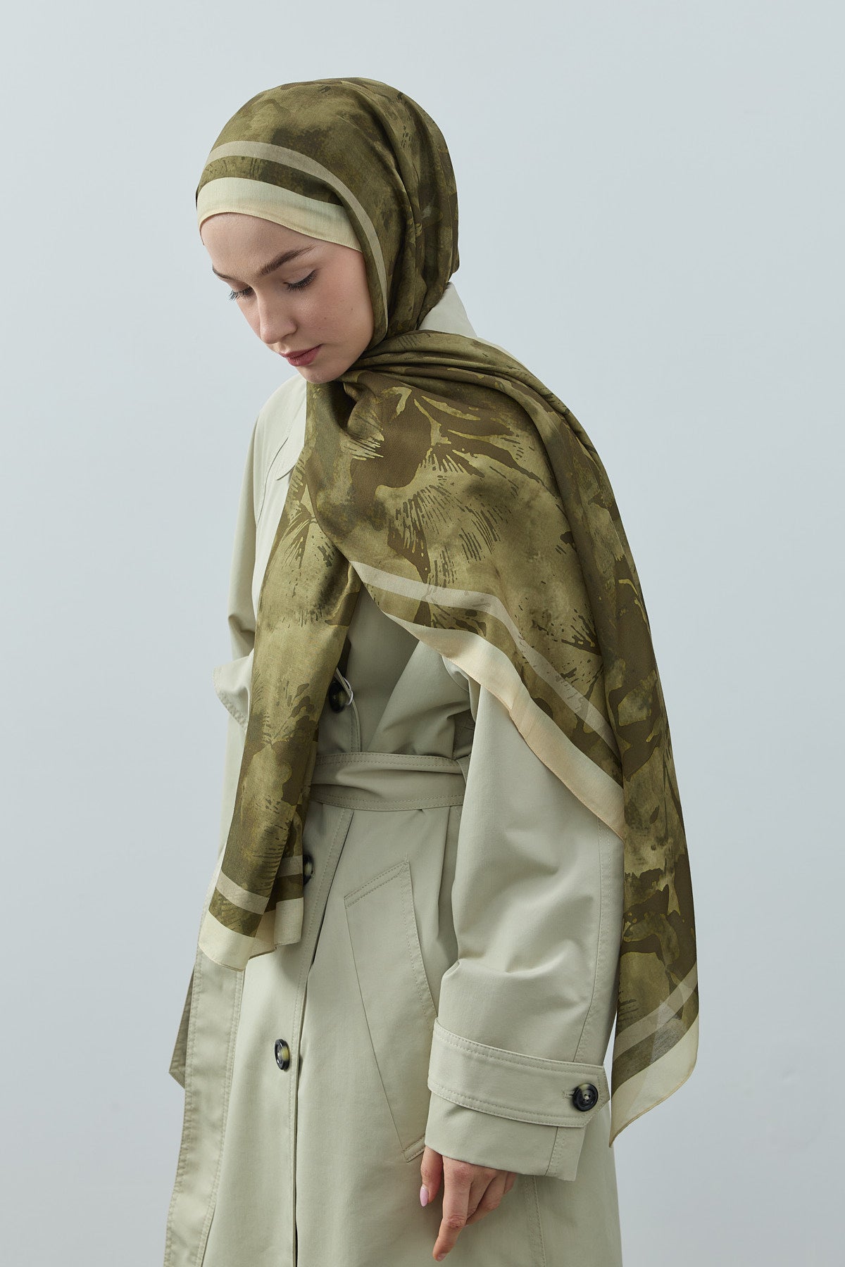Winter Echoes Mansion Garden Desen Şal – Haki, köşk bahçelerindeki doğal çiçek dokularından ilham alır ve bu zarif mirası haki tonun huzuruyla birleştirir. Her desen, Anadolu’nun bahçe serinliğini ve toprağın dinginliğini üzerinize taşır.