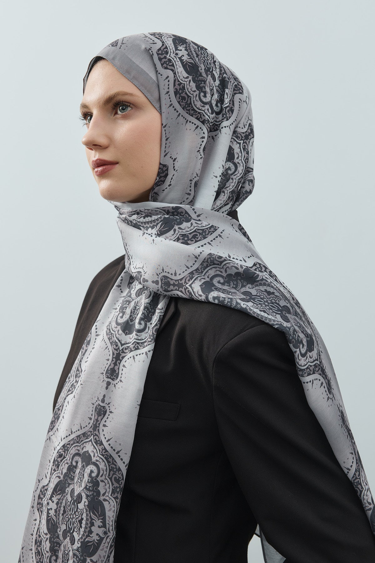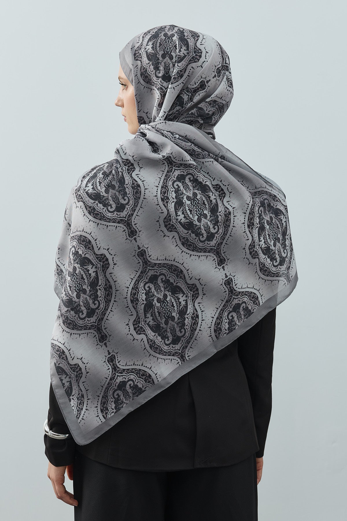 Winter Echoes Palace Texture Desen Şal – Gri, sadece bir aksesuar değil; degradeli motiflerin saray zarafetiyle birleştiği şık bir ifadedir.