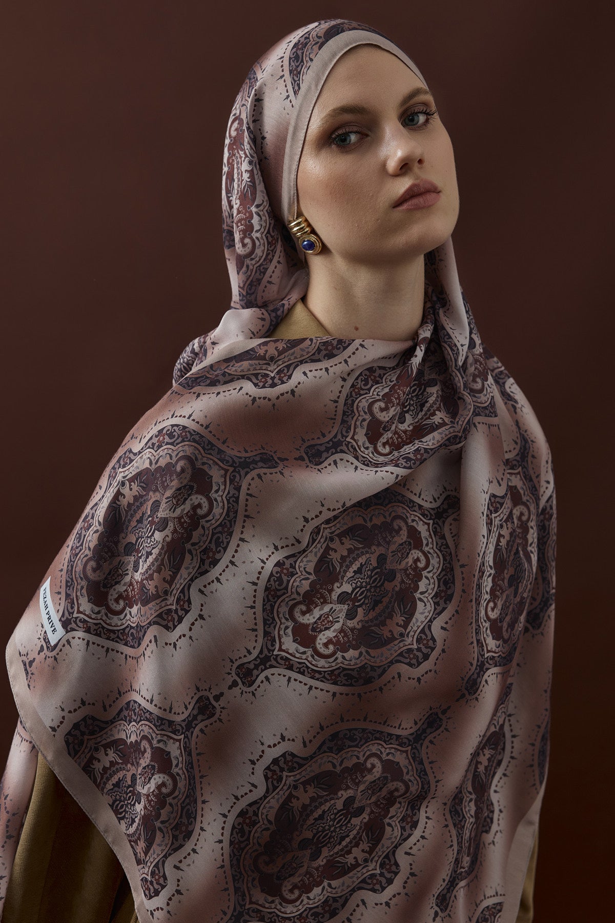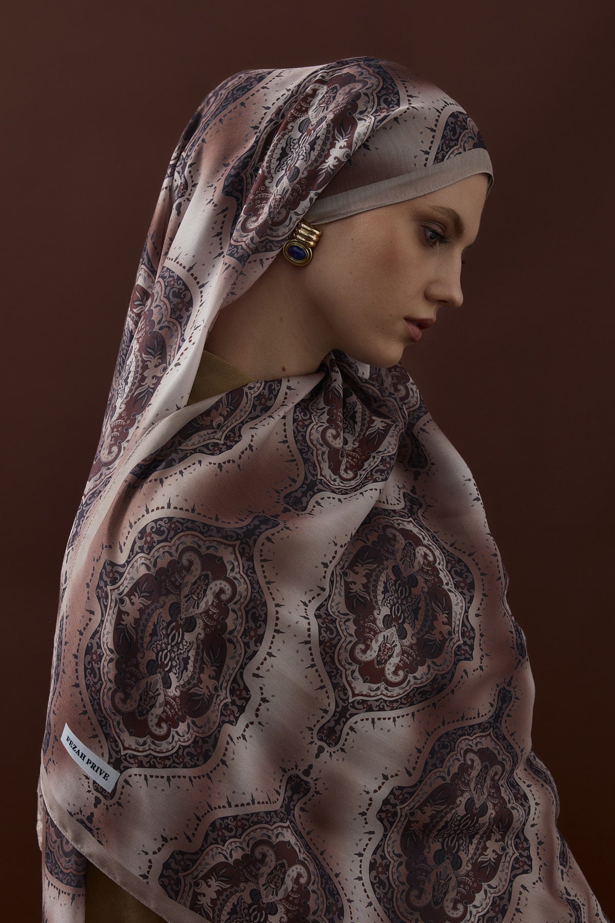 Winter Echoes Palace Texture Desen Şal – Krem, “Palace Texture” koleksiyonunun zarif degradeli saray motifleri ile bezenmiş özel bir tasarımıdır. Her ton geçişi, saray kabartmalarının gölgelerinden ve duvar işlemelerinden ilham alır — krem rengin zarafeti bu dokularla birleşerek her kombine sıcak bir hava katar.