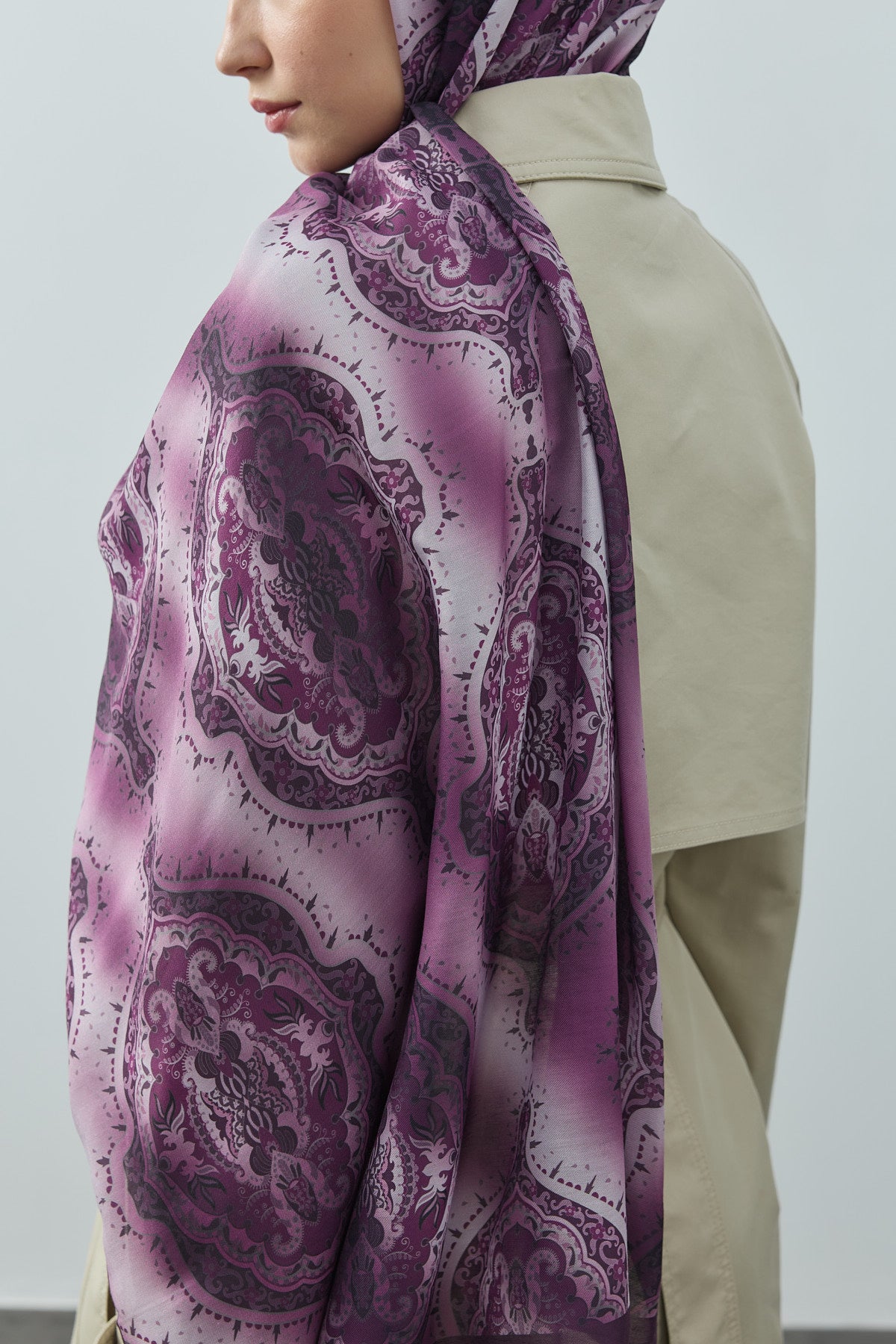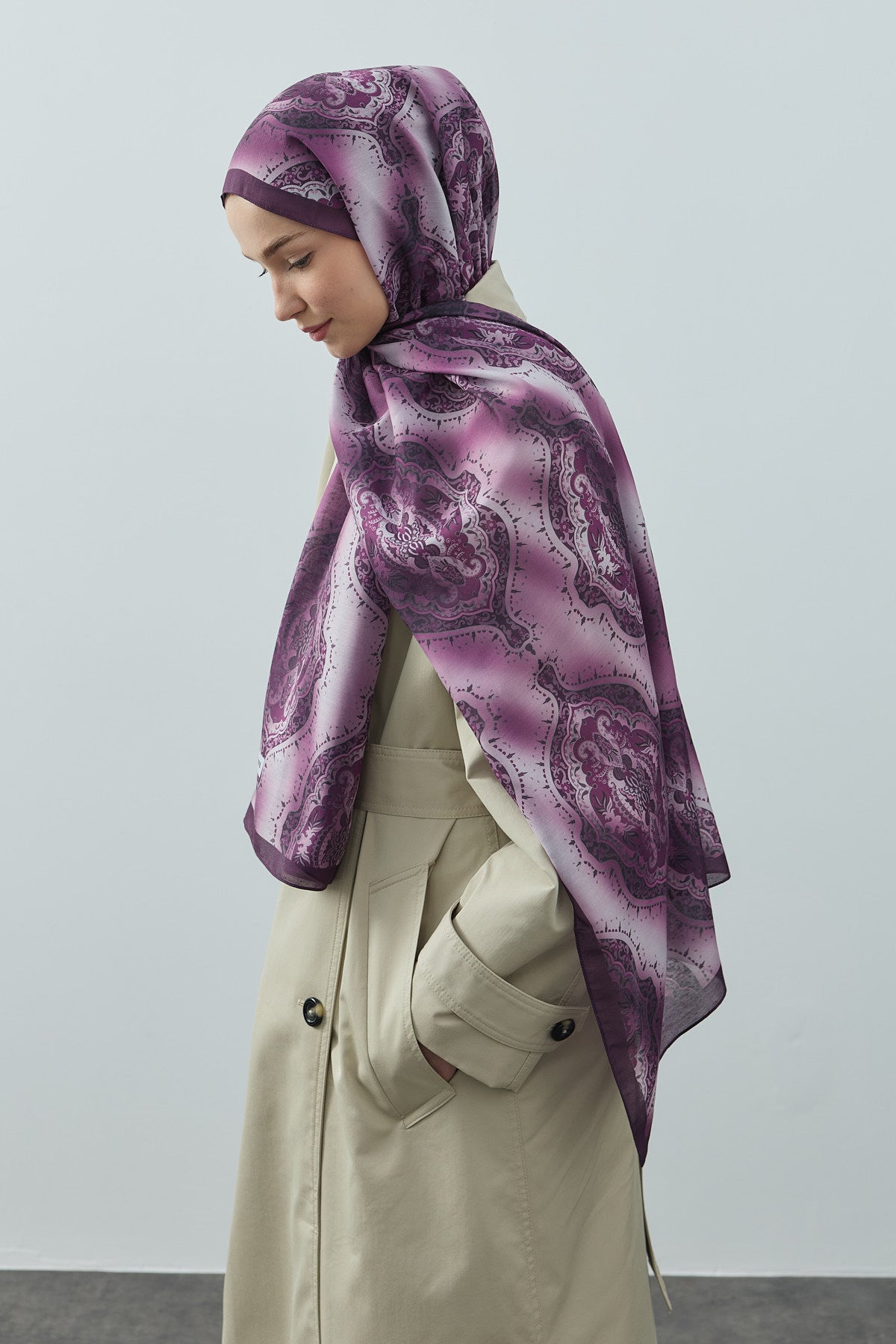 Winter Echoes Palace Texture Desen Şal – Mor, sadece bir aksesuar değil; degradeli motiflerle saray dokusunu stilinize taşıyan zarif bir ifadedir. Pamuk dokusu, ütü gerektirmeyen yapısı ve ton geçişli desenin lüks dokusu, kombinlerinize karakter, incelik ve zamansız şıklık katar.