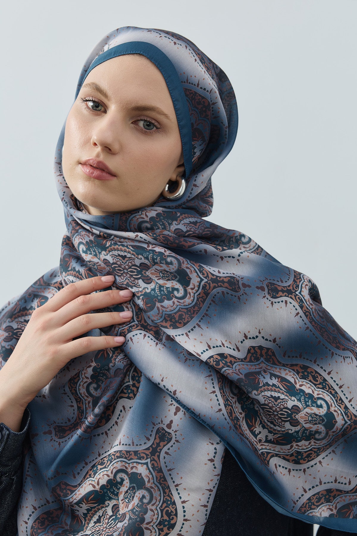 Tok, dökümlü ve hafif duruş, şalın formunu koruyarak zarif bir ifade kazandırır.