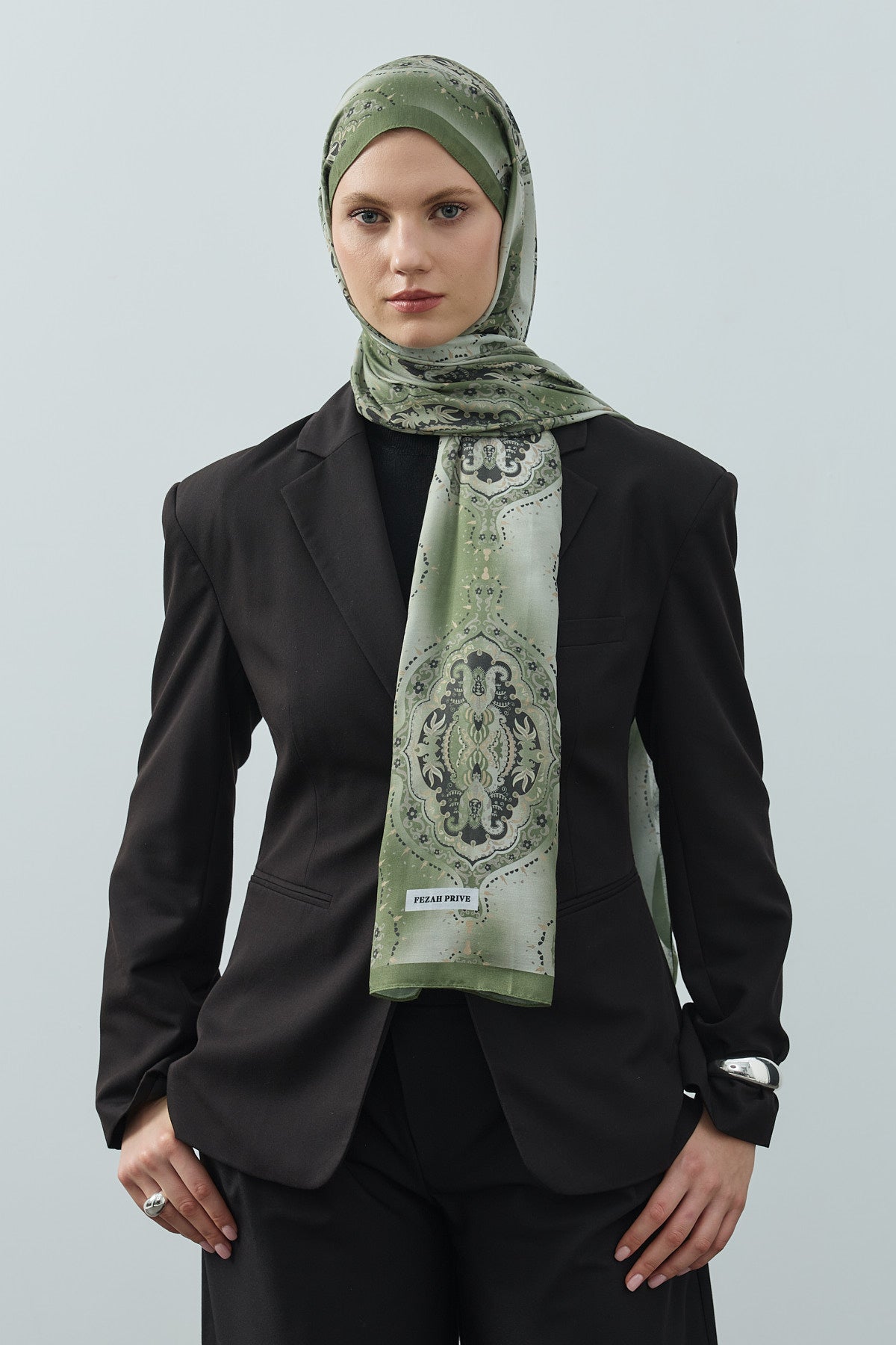 Winter Echoes Palace Texture Desen Şal – Yeşil, yalnızca bir şal değil; saray desenlerinin bahçeyle buluştuğu zarif bir ifadedir.
